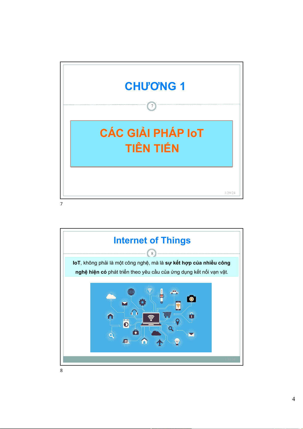 § Thực hành/Thí nghiệm/Bài tập/Thảo luận: 20% § Kiểm tra giữa kỳ: 10% § Kiểm tra cuối kỳ: 60 % 1/29/24 6 3 CHƯƠNG 1 7 CÁC GIẢI PHÁP IoT TIÊN TIẾN 1/29/24 7 Internet of Things 8