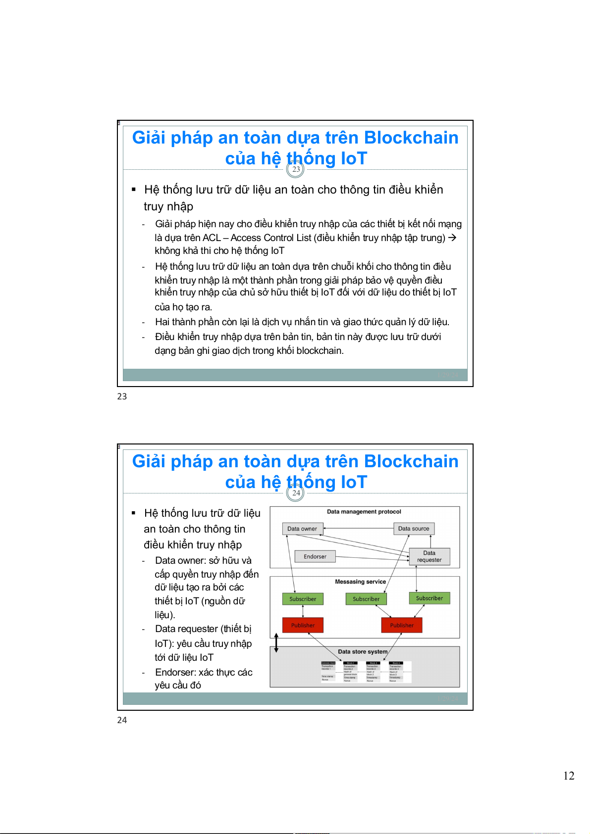 dữ liệu tạo ra bởi các thiết bị IoT (nguồn dữ liệu). - Data requester (thiết bị IoT): yêu cầu truy nhập tới dữ liệu IoT - Endorser: xác thực các yêu cầu đó 1/29/24 24 12