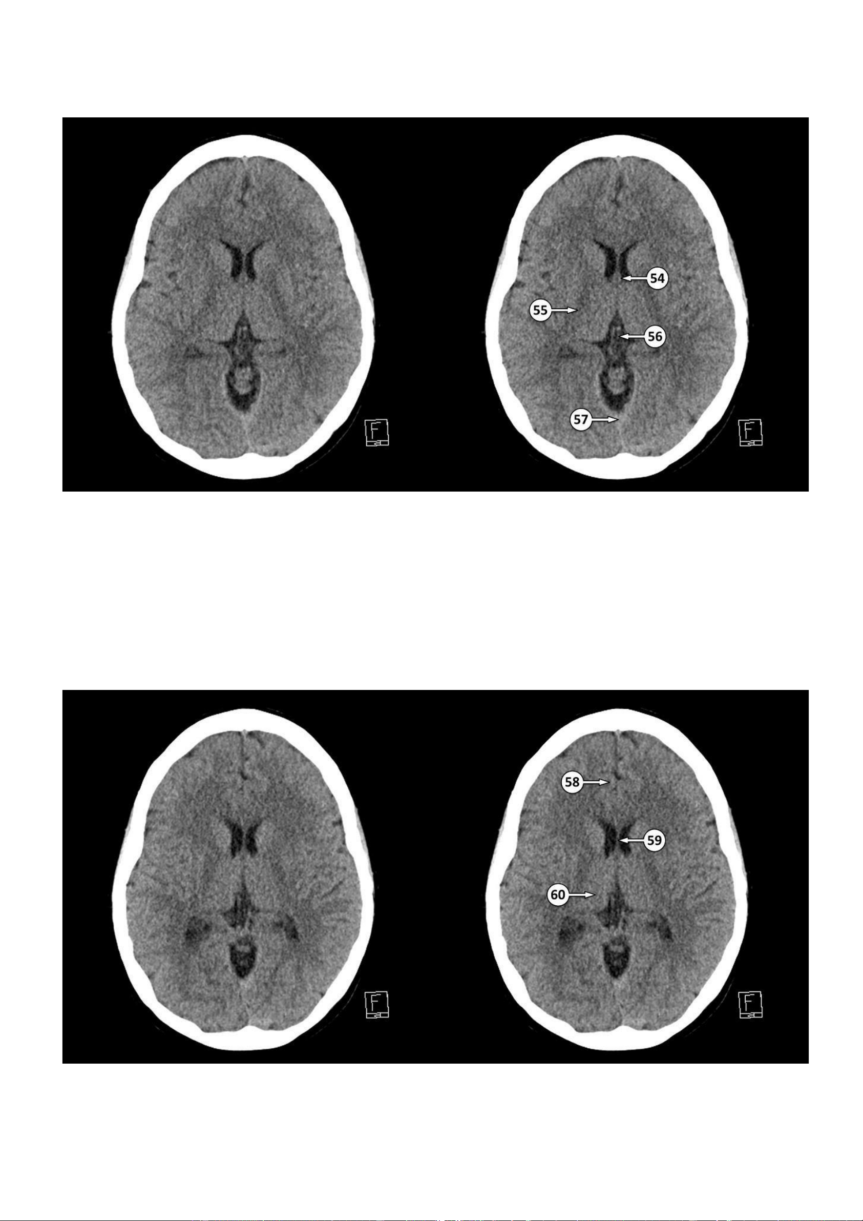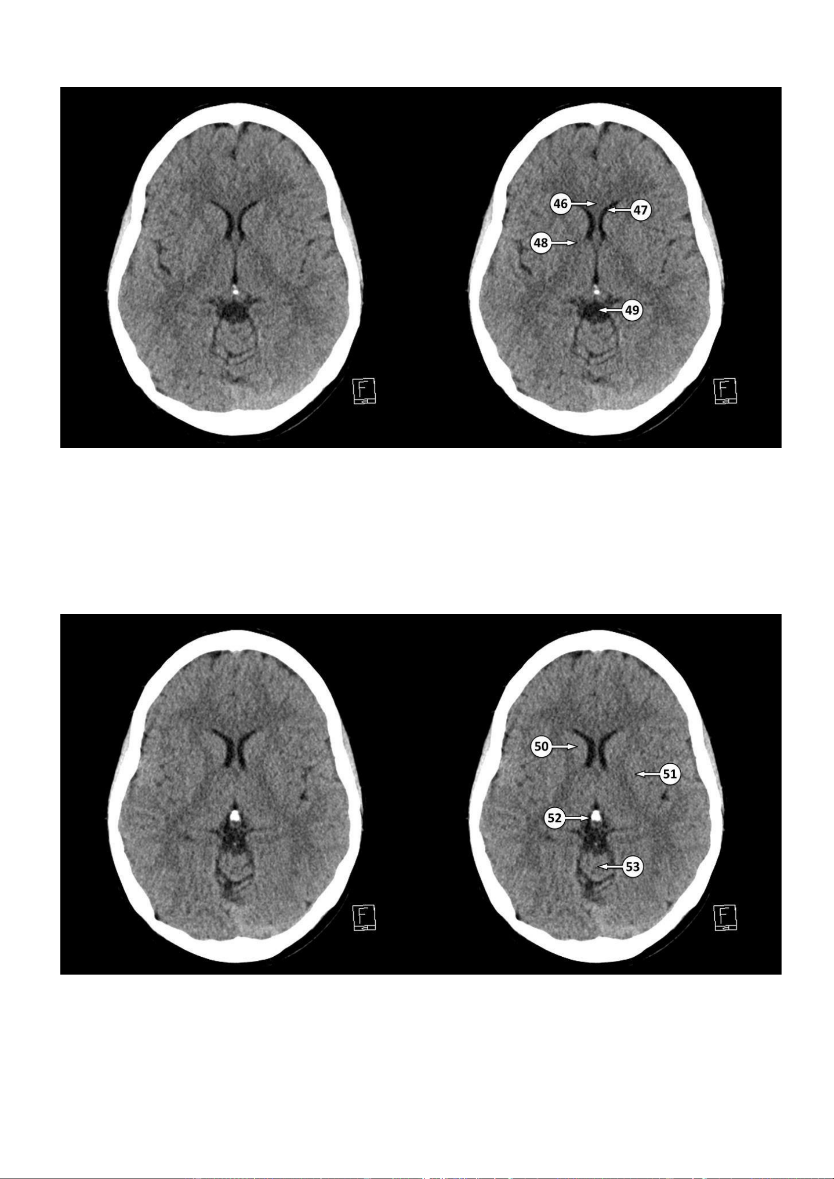 sừng trán của não thất bên 48 genu of the internal capsule gối của bao trong 49 quadrigeminal cistern bể quanh củ não sinh tư 50 head of the caudate nucleus đầu của nhân đuôi 51 lentiform nucleus nhân đậu (nhân bèo) 52 pineal gland tuyến tùng 53