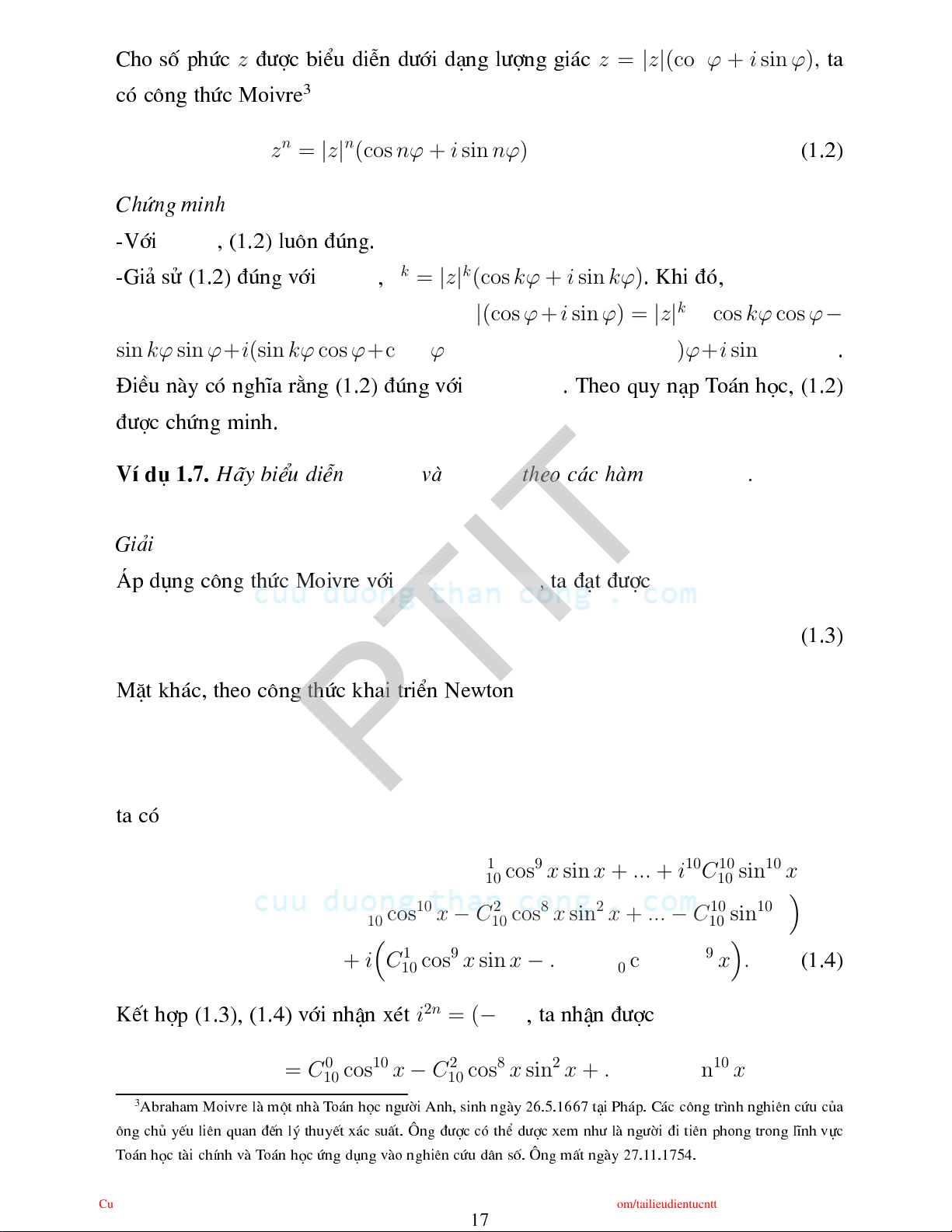 sin 10x = C010 cos10 x − C210 cos8 x sin2 x + ... − C10 10 sin10 x 3 Abraham Moivre lµ mét nhµ T o¸n hä ngêi Anh, sinh ngµy 26.5.1667 t¹i Ph¸p. C¸ «ng tr×nh nghiªn øu ña «ng hñ yÕu liªn quan ®Õn lý thuyÕt x¸ suÊt. ¤ng ®î ã thÓ dî xem nh lµ ngêi ®i tiªn phong trong lÜnh vù T o¸n hä tµi hÝnh vµ T o¸n hä øng dng vµo nghiªn øu d©n sè. ¤ng mÊt ngµy 27.1 1.1754. CuuDuongThanCong.com