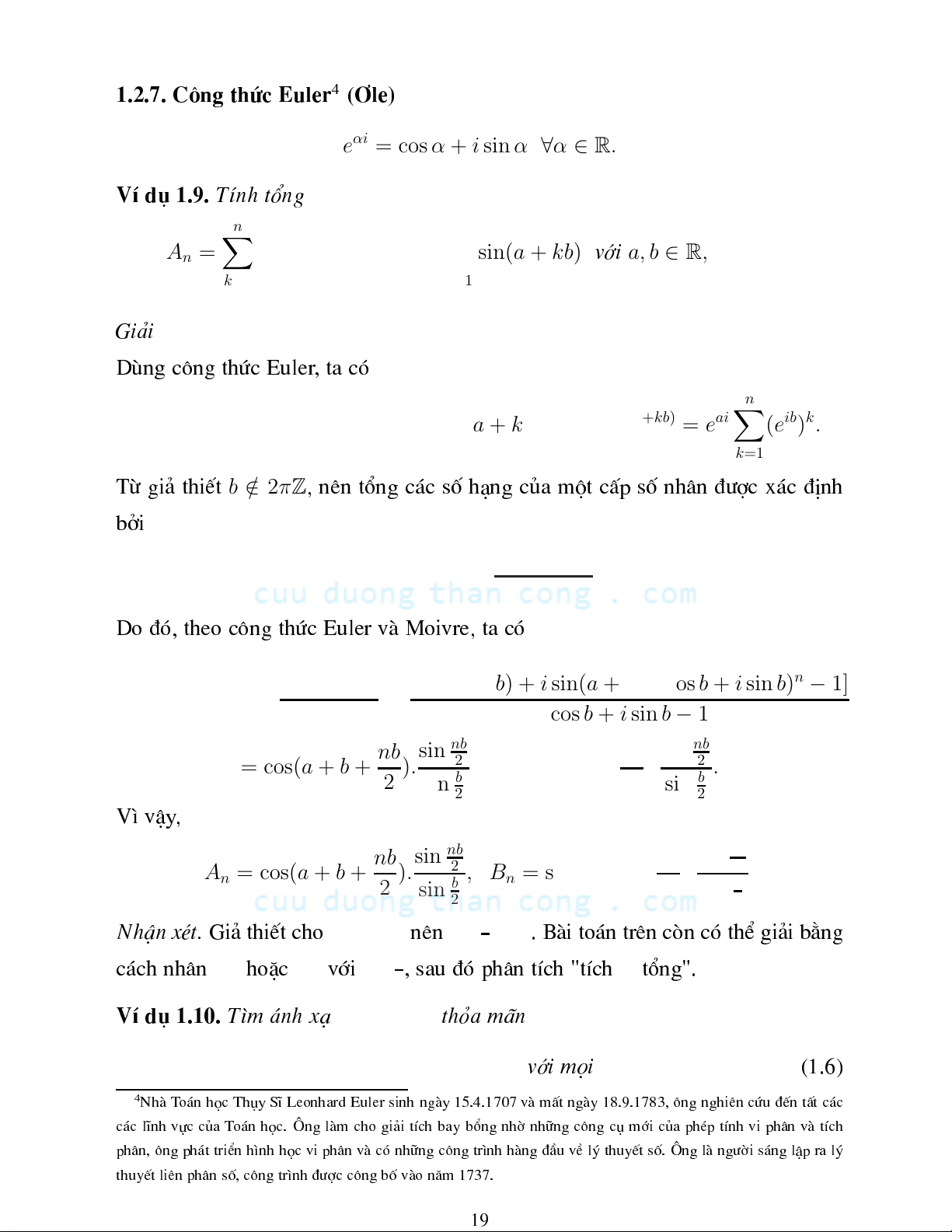 2 6= 0. Bµi to¸n trªn ßn ã thÓ gi¶i b»ng An Bn sin b → ¸h nh©n hoÆ víi 2 , sau ®ã ph©n tÝh "tÝh tæng". f : C → C VÝ d 1.10. T×m ¸nh x¹ tháa m·n f (z) + zf (−z) = 1 + z z ∈ C. víi mäi (1.6) 4 Nhµ T o¸n hä Thy SÜ Leonhard Euler sinh ngµy 15.4.1707 vµ mÊt ngµy 18.9.1783, «ng nghiªn øu ®Õn tÊt ¸ ¸ lÜnh vù ña T o¸n hä. ¤ng lµm ho gi¶i tÝh bay bæng nhê nh÷ng «ng míi ña php tÝnh vi ph©n vµ tÝh ph©n, «ng ph¸t triÓn h×nh hä vi ph©n vµ ã nh÷ng «ng tr×nh hµng ®Çu vÒ lý thuyÕt sè. ¤ng lµ ngêi s¸ng lËp ra lý thuyÕt liªn ph©n sè, «ng tr×nh ®î «ng bè vµo n¨m 1737. CuuDuongThanCong.com