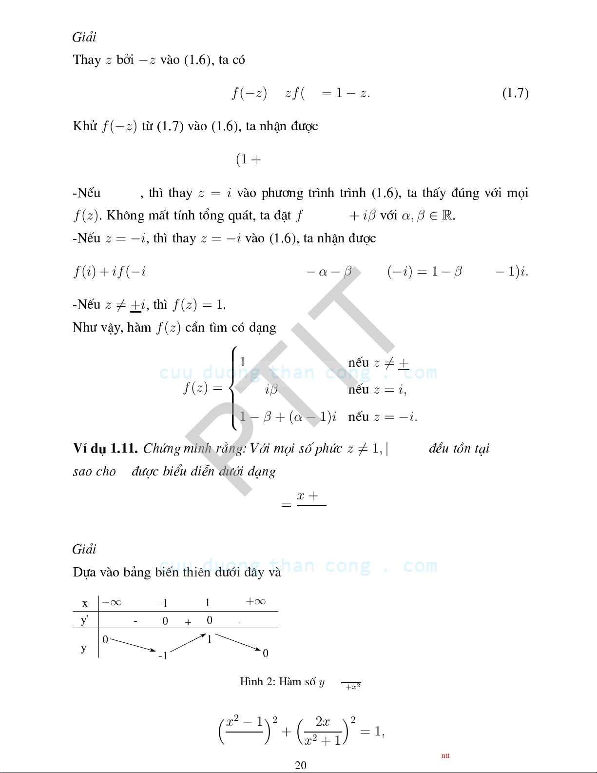 f (i) + if (−i) = 1 + i ⇔ if(−i) = 1 + i − α − βi ⇔ f(−i) = 1 − β + (α − 1)i. z 6= +i f (z) = 1 -NÕu , th× . f (z) Nh vËy , hµm Çn t×m ã d¹ng 1 z 6= +i, nÕu f (z) = α + iβ z = i, nÕu 1 − β + (α − 1)i z = −i. nÕu z 6= 1, |z| = 1 x ∈ R VÝ d 1.11. Chøng minh r»ng: Víi mäi sè phø ®Òu tån t¹i z PTIT sao ho ®î biÓu diÔn díi d¹ng x + i z = . x − i Gi¶i Dùa vµo b¶ng biÕn thiªn díi ®©y vµ x −∞ +∞ 1 -1 y' 0 - 0 - + 1 0 y 0 -1 y = 2x H×nh 2: Hµm sè 1+x2 x2 − 12 2x 2 + = 1, x2 + 1 x2 + 1 CuuDuongThanCong.com