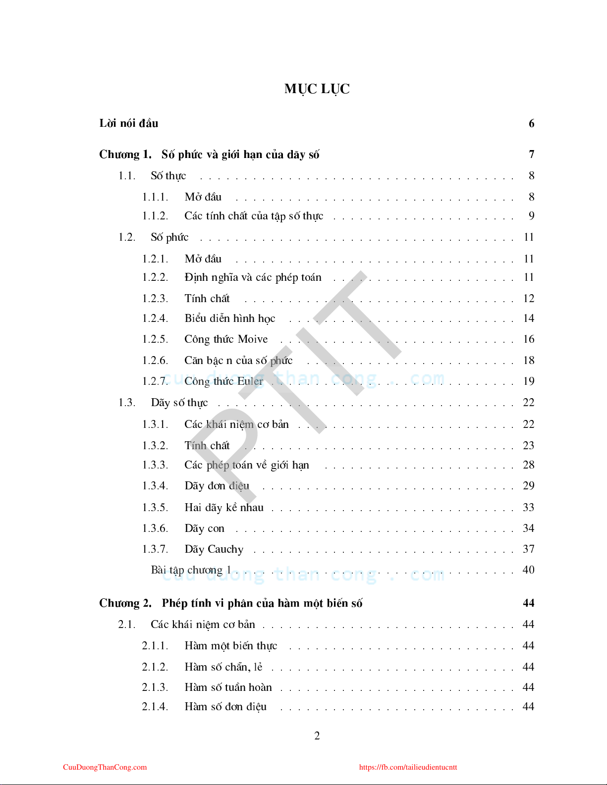 https://fb.com/tailieudientucntt M l Lêi nãi ®Çu 6 Ch¬ng 1. Sè phø vµ giíi h¹n ña d·y sè 7 1.1. Sè thù . . . . . . . . . . . . . . . . . . . . . . . . . . . . . . . . . . . . 8 1.1.1. Më ®Çu . . . . . . . . . . . . . . . . . . . . . . . . . . . . . . . . 8 1.1.2. C¸ tÝnh hÊt ña tËp sè thù . . . . . . . . . . . . . . . . . . . . . 9 1.2. Sè phø . . . . . . . . . . . . . . . . . . . . . . . . . . . . . . . . . . . . 1 1 1.2.1. Më ®Çu . . . . . . . . . . . . . . . . . . . . . . . . . . . . . . . . 1 1 1.2.2. §Þnh nghÜa vµ ¸ php to¸n . . . . . . . . . . . . . . . . . . . . . 1 1 1.2.3. TÝnh hÊt . . . . . . . . . . . . . . . . . . . . . . . . . . . . . . . 12 1.2.4. BiÓu diÔn h×nh hä . . . . . . . . . . . . . . . . . . . . . . . . . . 14 1.2.5. C«ng thø Moive . . . . . . . . . . . . . . . . . . . . . . . . . . . 16 1.2.6. C¨n bË n ña sè phø . . . . . . . . . . . . . . . . . . . . . . . . 18 1.2.7. C«ng thø Euler . . . . . . . . . . . . . . . . . . . . . . . . . . . . 19 1.3. D·y sè thù . . . . . . . . . . . . . . . . . . . . . . . . . . . . . . . . . . 22 1.3.1. C¸ kh¸i niÖm ¬ b¶n . . . . . . . . . . . . . . . . . . . . . . . . . 22 1.3.2. TÝnh hÊt . . . . . . . . . . . . . . . . . . . . . . . . . . . . . . . 23 1.3.3. C¸ php to¸n vÒ giíi h¹n . . . . . . . . . . . . . . . . . . . . . . 28 PTIT 1.3.4. D·y ®¬n ®iÖu . . . . . . . . . . . . . . . . . . . . . . . . . . . . . 29 1.3.5. Hai d·y kÒ nhau . . . . . . . . . . . . . . . . . . . . . . . . . . . . 33 1.3.6. D·y on . . . . . . . . . . . . . . . . . . . . . . . . . . . . . . . . 34 1.3.7. D·y Cauhy . . . . . . . . . . . . . . . . . . . . . . . . . . . . . . 37 Bµi tËp h¬ng 1 . . . . . . . . . . . . . . . . . . . . . . . . . . . . . . . . 40 Ch¬ng 2. Php tÝnh vi ph©n ña hµm mét biÕn sè 44 2.1. C¸ kh¸i niÖm ¬ b¶n . . . . . . . . . . . . . . . . . . . . . . . . . . . . . 44 2.1.1. Hµm mét biÕn thù . . . . . . . . . . . . . . . . . . . . . . . . . . 44 2.1.2. Hµm sè h½n, lÎ . . . . . . . . . . . . . . . . . . . . . . . . . . . . 44 2.1.3. Hµm sè tuÇn hoµn . . . . . . . . . . . . . . . . . . . . . . . . . . . 44 2.1.4. Hµm sè ®¬n ®iÖu . . . . . . . . . . . . . . . . . . . . . . . . . . . 44 2 CuuDuongThanCong.com