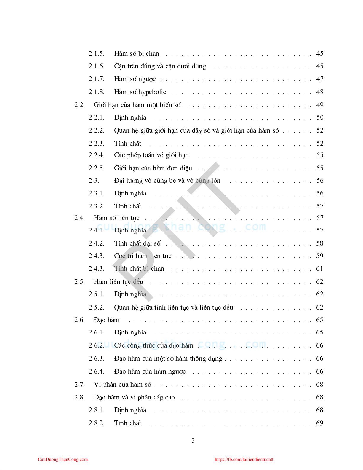 https://fb.com/tailieudientucntt 2.1.5. Hµm sè bÞ hÆn . . . . . . . . . . . . . . . . . . . . . . . . . . . . 45 2.1.6. CËn trªn ®óng vµ Ën díi ®óng . . . . . . . . . . . . . . . . . . . 45 2.1.7. Hµm sè ngî . . . . . . . . . . . . . . . . . . . . . . . . . . . . . 47 2.1.8. Hµm sè hypeboli . . . . . . . . . . . . . . . . . . . . . . . . . . . 48 2.2. Giíi h¹n ña hµm mét biÕn sè . . . . . . . . . . . . . . . . . . . . . . . . 49 2.2.1. §Þnh nghÜa . . . . . . . . . . . . . . . . . . . . . . . . . . . . . . 50 2.2.2. Quan hÖ gi÷a giíi h¹n ña d·y sè vµ giíi h¹n ña hµm sè . . . . . . 52 2.2.3. TÝnh hÊt . . . . . . . . . . . . . . . . . . . . . . . . . . . . . . . 52 2.2.4. C¸ php to¸n vÒ giíi h¹n . . . . . . . . . . . . . . . . . . . . . . 55 2.2.5. Giíi h¹n ña hµm ®¬n ®iÖu . . . . . . . . . . . . . . . . . . . . . . 55 2.3. §¹i lîng v« ïng b vµ v« ïng lín . . . . . . . . . . . . . . . . 56 2.3.1. §Þnh nghÜa . . . . . . . . . . . . . . . . . . . . . . . . . . . . . . 56 2.3.2. TÝnh hÊt . . . . . . . . . . . . . . . . . . . . . . . . . . . . . . . 57 2.4. Hµm sè liªn t . . . . . . . . . . . . . . . . . . . . . . . . . . . . . . . . 57 2.4.1. §Þnh nghÜa . . . . . . . . . . . . . . . . . . . . . . . . . . . . . . 57 2.4.2. TÝnh hÊt ®¹i sè . . . . . . . . . . . . . . . . . . . . . . . . . . . . 58 2.4.3. Cù trÞ hµm liªn t . . . . . . . . . . . . . . . . . . . . . . . . . . 59 2.4.3. TÝnh hÊt bÞ hÆn . . . . . . . . . . . . . . . . . . . . . . . . . . . 61 2.5. Hµm liªn t ®Òu . . . . . . . . . . . . . . . . . . . . . . . . . . . . . . . 62 PTIT 2.5.1. §Þnh nghÜa . . . . . . . . . . . . . . . . . . . . . . . . . . . . . . 62 2.5.2. Quan hÖ gi÷a tÝnh liªn t vµ liªn t ®Òu . . . . . . . . . . . . . . 62 2.6. §¹o hµm . . . . . . . . . . . . . . . . . . . . . . . . . . . . . . . . . . . 65 2.6.1. §Þnh nghÜa . . . . . . . . . . . . . . . . . . . . . . . . . . . . . . 65 2.6.2. C¸ «ng thø ña ®¹o hµm . . . . . . . . . . . . . . . . . . . . . . 66 2.6.3. §¹o hµm ña mét sè hµm th«ng dng . . . . . . . . . . . . . . . . . 66 2.6.4. §¹o hµm ña hµm ngî . . . . . . . . . . . . . . . . . . . . . . . 66 2.7. Vi ph©n ña hµm sè . . . . . . . . . . . . . . . . . . . . . . . . . . . . . . 68 2.8. §¹o hµm vµ vi ph©n Êp ao . . . . . . . . . . . . . . . . . . . . . . . . . 68 2.8.1. §Þnh nghÜa . . . . . . . . . . . . . . . . . . . . . . . . . . . . . . 68 2.8.2. TÝnh hÊt . . . . . . . . . . . . . . . . . . . . . . . . . . . . . . . 69 3 CuuDuongThanCong.com