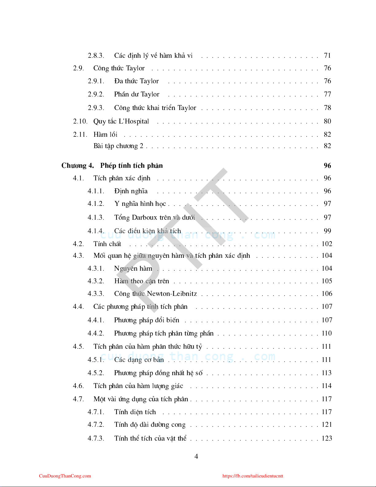 https://fb.com/tailieudientucntt 2.8.3. C¸ ®Þnh lý vÒ hµm kh¶ vi . . . . . . . . . . . . . . . . . . . . . . 71 2.9. C«ng thø T aylor . . . . . . . . . . . . . . . . . . . . . . . . . . . . . . . 76 2.9.1. §a thø T aylor . . . . . . . . . . . . . . . . . . . . . . . . . . . . 76 2.9.2. PhÇn d T aylor . . . . . . . . . . . . . . . . . . . . . . . . . . . . 77 2.9.3. C«ng thø khai triÓn T aylor . . . . . . . . . . . . . . . . . . . . . . 78 2.10. Quy t¾ L'Hospital . . . . . . . . . . . . . . . . . . . . . . . . . . . . . . 80 2.1 1. Hµm låi . . . . . . . . . . . . . . . . . . . . . . . . . . . . . . . . . . . . 82 Bµi tËp h¬ng 2 . . . . . . . . . . . . . . . . . . . . . . . . . . . . . . . . 82 Ch¬ng 4. Php tÝnh tÝh ph©n 96 4.1. TÝh ph©n x¸ ®Þnh . . . . . . . . . . . . . . . . . . . . . . . . . . . . . . 96 4.1.1. §Þnh nghÜa . . . . . . . . . . . . . . . . . . . . . . . . . . . . . . 96 4.1.2. Y nghÜa h×nh hä . . . . . . . . . . . . . . . . . . . . . . . . . . . . 97 4.1.3. Tæng Darboux trªn vµ díi . . . . . . . . . . . . . . . . . . . . . . 97 4.1.4. C¸ ®iÒu kiÖn kh¶ tÝh . . . . . . . . . . . . . . . . . . . . . . . . 99 4.2. TÝnh hÊt . . . . . . . . . . . . . . . . . . . . . . . . . . . . . . . . . . . 102 4.3. Mèi quan hÖ gi÷a nguyªn hµm vµ tÝh ph©n x¸ ®Þnh . . . . . . . . . . . . 104 4.3.1. Nguyªn hµm . . . . . . . . . . . . . . . . . . . . . . . . . . . . . . 104 4.3.2. Hµm theo Ën trªn . . . . . . . . . . . . . . . . . . . . . . . . . . . 105 4.3.3. C«ng thø Newton-Leibnitz . . . . . . . . . . . . . . . . . . . . . . 106 PTIT 4.4. C¸ ph¬ng ph¸p tÝnh tÝh ph©n . . . . . . . . . . . . . . . . . . . . . . . 107 4.4.1. Ph¬ng ph¸p ®æi biÕn . . . . . . . . . . . . . . . . . . . . . . . . . 107 4.4.2. Ph¬ng ph¸p tÝh ph©n tõng phÇn . . . . . . . . . . . . . . . . . . . 1 10 4.5. TÝh ph©n ña hµm ph©n thø h÷u tû . . . . . . . . . . . . . . . . . . . . . 1 1 1 4.5.1. C¸ d¹ng ¬ b¶n . . . . . . . . . . . . . . . . . . . . . . . . . . . . 1 1 1 4.5.2. Ph¬ng ph¸p ®ång nhÊt hÖ sè . . . . . . . . . . . . . . . . . . . . . 1 13 4.6. TÝh ph©n ña hµm lîng gi¸ . . . . . . . . . . . . . . . . . . . . . . . . 1 14 4.7. Mét vµi øng dng ña tÝh ph©n . . . . . . . . . . . . . . . . . . . . . . . . 1 17 4.7.1. TÝnh diÖn tÝh . . . . . . . . . . . . . . . . . . . . . . . . . . . . . 1 17 4.7.2. TÝnh ®é dµi ®êng ong . . . . . . . . . . . . . . . . . . . . . . . . 121 4.7.3. TÝnh thÓ tÝh ña vËt thÓ . . . . . . . . . . . . . . . . . . . . . . . . 123 4 CuuDuongThanCong.com