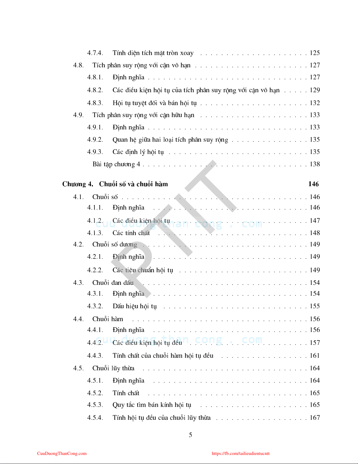 https://fb.com/tailieudientucntt 4.7.4. TÝnh diÖn tÝh mÆt trßn xoay . . . . . . . . . . . . . . . . . . . . . 125 4.8. TÝh ph©n suy réng víi Ën v« h¹n . . . . . . . . . . . . . . . . . . . . . . 127 4.8.1. §Þnh nghÜa . . . . . . . . . . . . . . . . . . . . . . . . . . . . . . . 127 4.8.2. C¸ ®iÒu kiÖn héi t ña tÝh ph©n suy réng víi Ën v« h¹n . . . . . 129 4.8.3. Héi t tuyÖt ®èi vµ b¸n héi t . . . . . . . . . . . . . . . . . . . . . 132 4.9. TÝh ph©n suy réng víi Ën h÷u h¹n . . . . . . . . . . . . . . . . . . . . . 133 4.9.1. §Þnh nghÜa . . . . . . . . . . . . . . . . . . . . . . . . . . . . . . . 133 4.9.2. Quan hÖ gi÷a hai lo¹i tÝh ph©n suy réng . . . . . . . . . . . . . . . 135 4.9.3. C¸ ®Þnh lý héi t . . . . . . . . . . . . . . . . . . . . . . . . . . . 135 Bµi tËp h¬ng 4 . . . . . . . . . . . . . . . . . . . . . . . . . . . . . . . . 138 Ch¬ng 4. Chuçi sè vµ huçi hµm 146 4.1. Chuçi sè . . . . . . . . . . . . . . . . . . . . . . . . . . . . . . . . . . . . 146 4.1.1. §Þnh nghÜa . . . . . . . . . . . . . . . . . . . . . . . . . . . . . . 146 4.1.2. C¸ ®iÒu kiÖn héi t . . . . . . . . . . . . . . . . . . . . . . . . . . 147 4.1.3. C¸ tÝnh hÊt . . . . . . . . . . . . . . . . . . . . . . . . . . . . . 148 4.2. Chuçi sè d¬ng . . . . . . . . . . . . . . . . . . . . . . . . . . . . . . . . 149 4.2.1. §Þnh nghÜa . . . . . . . . . . . . . . . . . . . . . . . . . . . . . . 149 4.2.2. C¸ tiªu huÈn héi t . . . . . . . . . . . . . . . . . . . . . . . . . 149 PTIT 4.3. Chuçi ®an dÊu . . . . . . . . . . . . . . . . . . . . . . . . . . . . . . . . 154 4.3.1. §Þnh nghÜa . . . . . . . . . . . . . . . . . . . . . . . . . . . . . . 154 4.3.2. DÊu hiÖu héi t . . . . . . . . . . . . . . . . . . . . . . . . . . . . 155 4.4. Chuçi hµm . . . . . . . . . . . . . . . . . . . . . . . . . . . . . . . . . . 156 4.4.1. §Þnh nghÜa . . . . . . . . . . . . . . . . . . . . . . . . . . . . . . 156 4.4.2. C¸ ®iÒu kiÖn héi t ®Òu . . . . . . . . . . . . . . . . . . . . . . . 157 4.4.3. TÝnh hÊt ña huçi hµm héi t ®Òu . . . . . . . . . . . . . . . . . 161 4.5. Chuçi lòy thõa . . . . . . . . . . . . . . . . . . . . . . . . . . . . . . . . 164 4.5.1. §Þnh nghÜa . . . . . . . . . . . . . . . . . . . . . . . . . . . . . . 164 4.5.2. TÝnh hÊt . . . . . . . . . . . . . . . . . . . . . . . . . . . . . . . 165 4.5.3. Quy t¾ t×m b¸n kÝnh héi t . . . . . . . . . . . . . . . . . . . . . 165 4.5.4. TÝnh héi t ®Òu ña huçi lòy thõa . . . . . . . . . . . . . . . . . . 167 5 CuuDuongThanCong.com