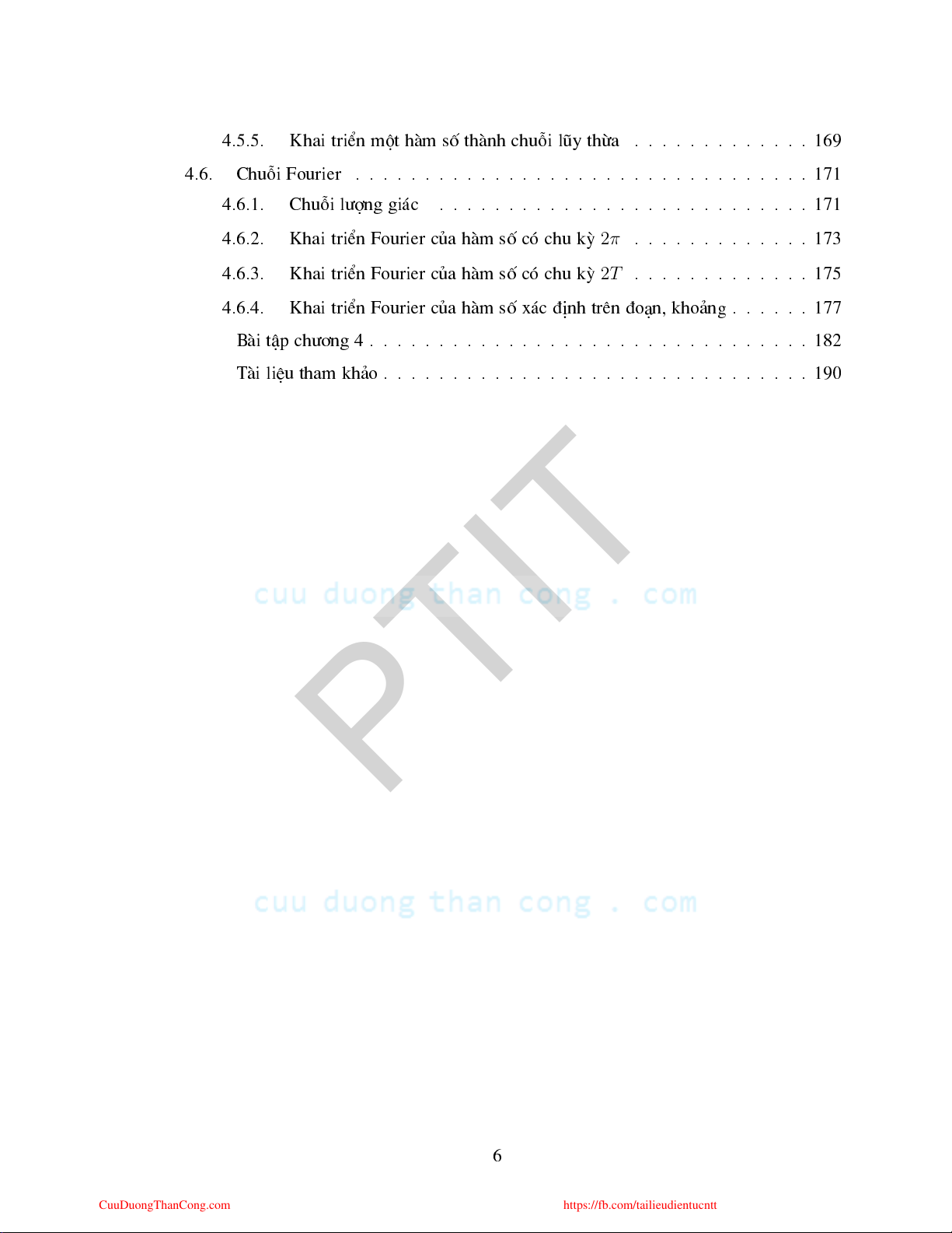 https://fb.com/tailieudientucntt 4.5.5. Khai triÓn mét hµm sè thµnh huçi lòy thõa . . . . . . . . . . . . . 169 4.6. Chuçi Fourier . . . . . . . . . . . . . . . . . . . . . . . . . . . . . . . . . 171 4.6.1. Chuçi lîng gi¸ . . . . . . . . . . . . . . . . . . . . . . . . . . . 171 2π 4.6.2. Khai triÓn Fourier ña hµm sè ã hu kú . . . . . . . . . . . . . 173 2T 4.6.3. Khai triÓn Fourier ña hµm sè ã hu kú . . . . . . . . . . . . . 175 4.6.4. Khai triÓn Fourier ña hµm sè x¸ ®Þnh trªn ®o¹n, kho¶ng . . . . . . 177 Bµi tËp h¬ng 4 . . . . . . . . . . . . . . . . . . . . . . . . . . . . . . . . 182 Tµi liÖu tham kh¶o . . . . . . . . . . . . . . . . . . . . . . . . . . . . . . . 190 PTIT 6 CuuDuongThanCong.com