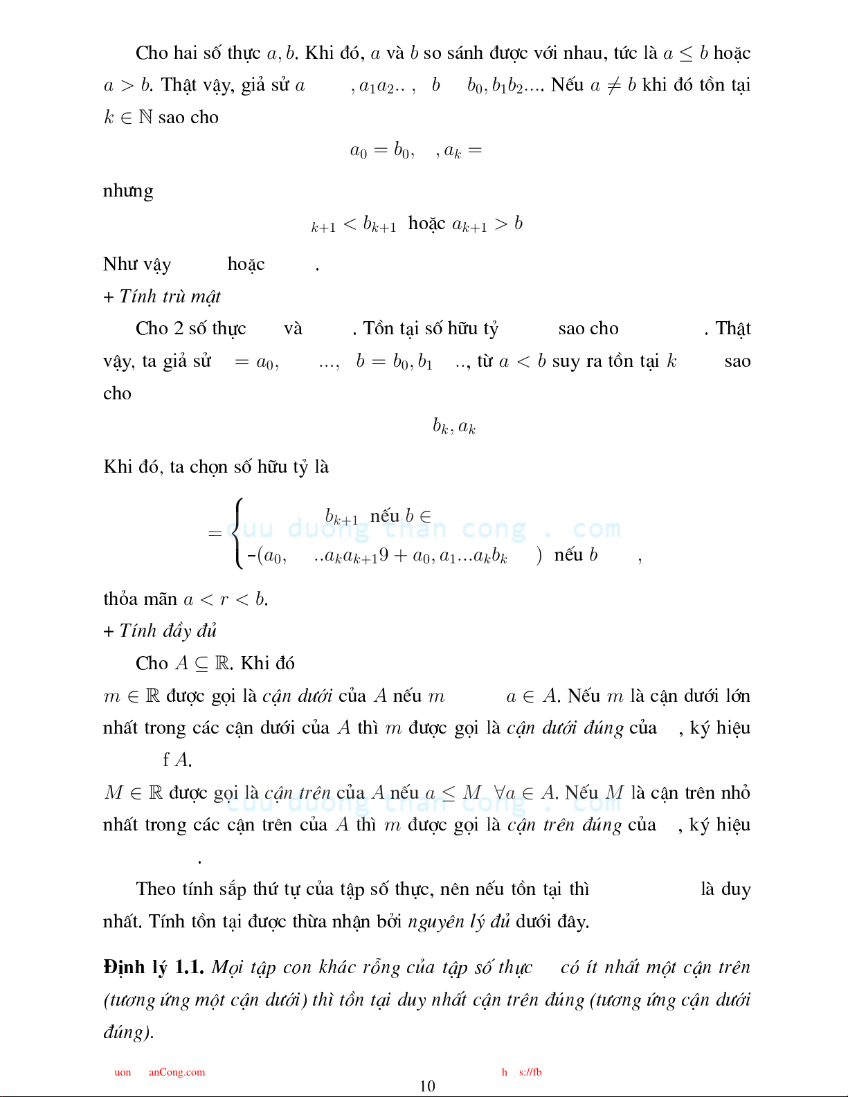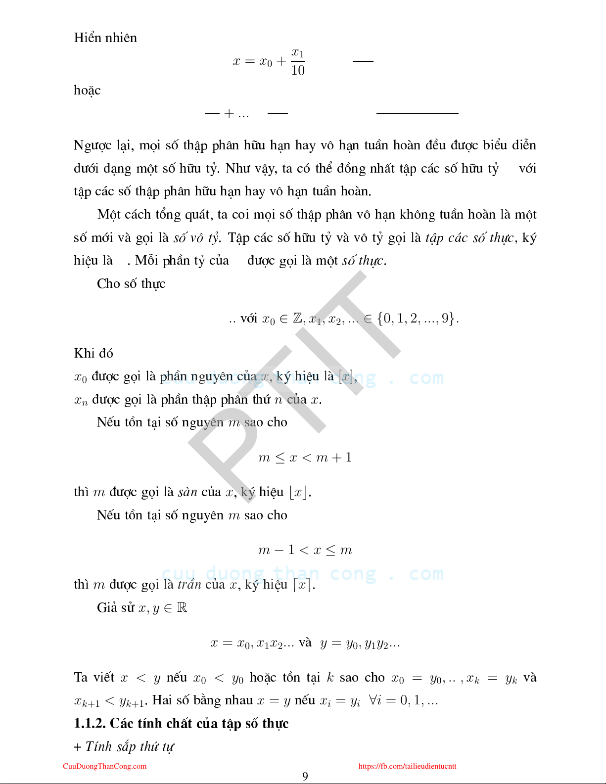 x0 ∈ Z, x1, x2, ... ∈ {0, 1, 2, ..., 9}. víi Khi ®ã x0 x [x] ®î gäi lµ phÇn nguyªn ña , ký hiÖu lµ , xn n x ®î gäi lµ phÇn thËp ph©n thø ña . m NÕu tån t¹i sè nguyªn sao ho m ≤ x < m + 1 PTIT m x ⌊x⌋ th× ®î gäi lµ sµn ña , ký hiÖu . m NÕu tån t¹i sè nguyªn sao ho m − 1 < x ≤ m m x ⌈x⌉ th× ®î gäi lµ trÇn ña , ký hiÖu . x, y ∈ R Gi¶ sö x = x0, x1x2... y = y0, y1y2... vµ x < y x0 < y0 k x0 = y0, ..., xk = yk T a viÕt nÕu hoÆ tån t¹i sao ho vµ xk+1 < yk+1 x = y xi = yi ∀i = 0, 1, ... . Hai sè b»ng nhau nÕu 1.1.2. C¸ tÝnh hÊt ña tËp sè thù + TÝnh s¾p thø tù CuuDuongThanCong.com