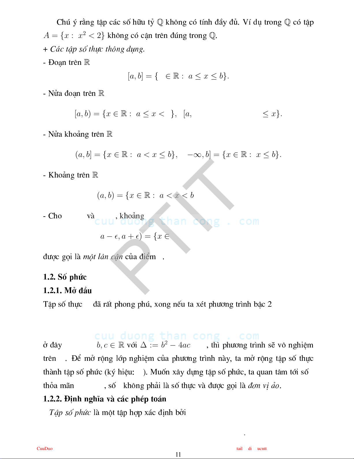 (a − ǫ, a + ǫ) = {x ∈ R : |x − a| < ǫ} = Bǫ(a) a ®î gäi lµ mét l©n Ën ña ®iÓm . 1.2. Sè phø PTIT 1.2.1. Më ®Çu R TËp sè thù ®· rÊt phong phó, xong nÕu ta xt ph¬ng tr×nh bË 2 ax2 + bx + c = 0, a 6= 0, a, b, c ∈ R ∆ := b2 − 4ac < 0 ë ®©y víi , th× ph¬ng tr×nh sÏ v« nghiÖm R trªn . §Ó më réng líp nghiÖm ña ph¬ng tr×nh nµy , ta më réng tËp sè thù C i thµnh tËp sè phø (ký hiÖu: ). Muèn x©y dùng tËp sè phø, ta quan t©m tíi sè i2 = −1 i tháa m·n , sè kh«ng ph¶i lµ sè thù vµ ®î gäi lµ ®¬n vÞ ¶o. 1.2.2. §Þnh nghÜa vµ ¸ php to¸n