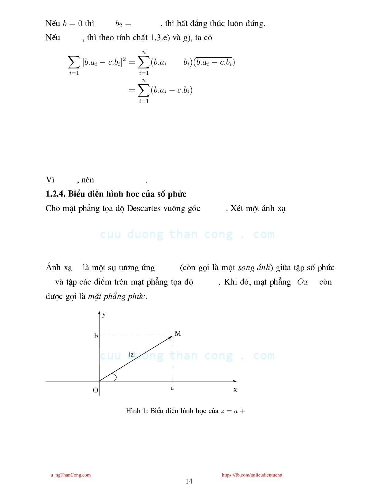 https://fb.com/tailieudientucntt 13 b = 0 b1 = b2 = ... = bn NÕu th× , th× bÊt ®¼ng thø lu«n ®óng. b > 0 NÕu , th× theo tÝnh hÊt 1.3.e) vµ g), ta ã n n X X 0 ≤ |b.ai − c.bi|2 = (b.ai − c.bi)(b.ai − c.bi) i=1 i=1 n X =