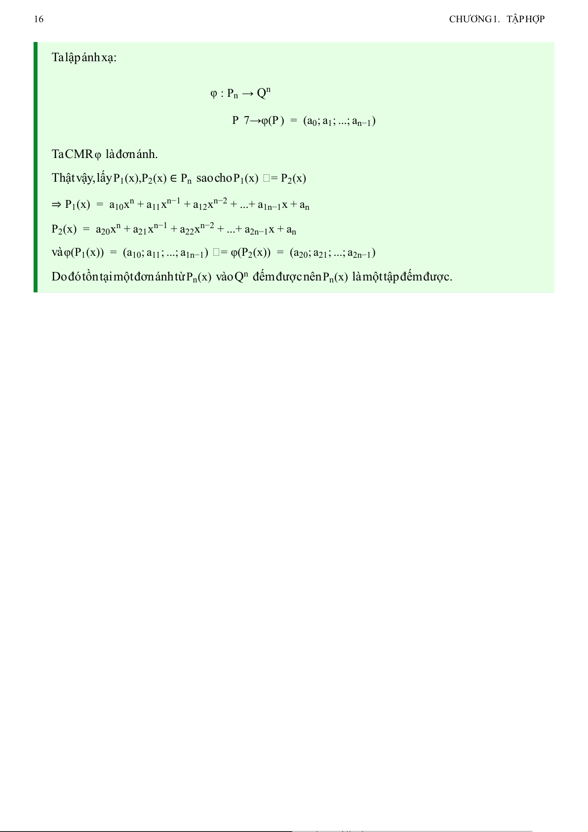 Chứngminhrằngtậpcácđathứcbậcnvớihệsốhữutỉlàtậpđếmđược Lờigiải 16 CHƯƠNG1. TẬPHỢP Talậpánhxạ: φ : Pn → Qn