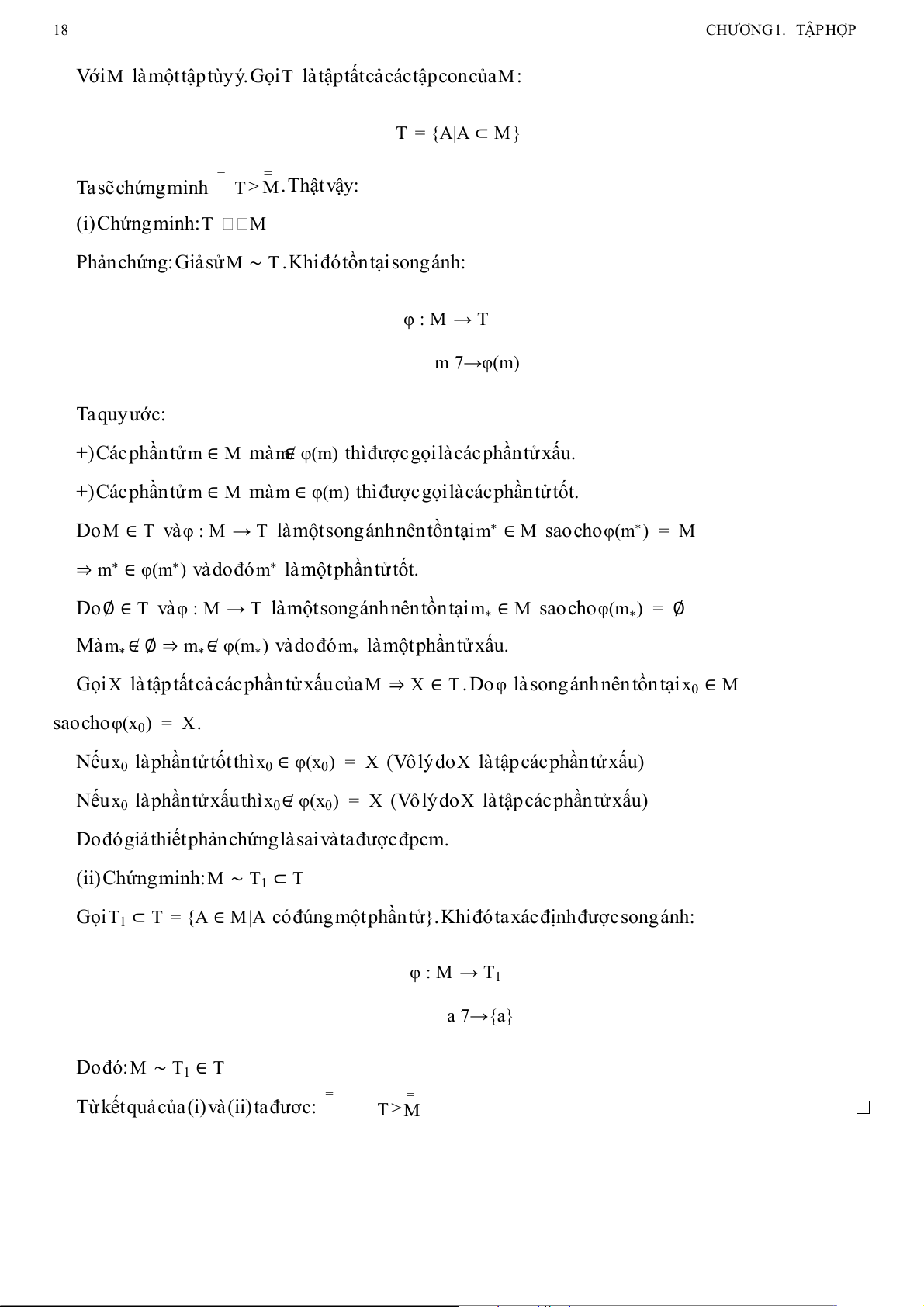 VớiM làmộttậptùyý.GọiT làtậptấtcảcáctậpconcủaM: T = {A|A ⊂ M} = = Tasẽchứngminh T > M.Thậtvậy: (i)Chứngminh:T M
