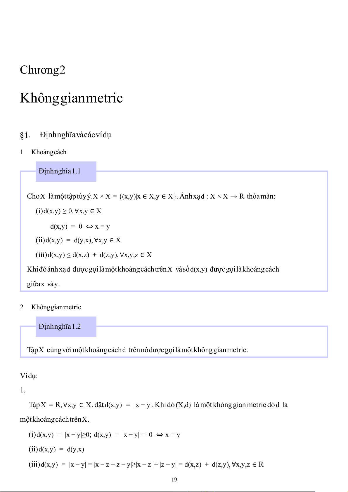Từkếtquảcủa(i)và(ii)tađươc: T > M Chương2 Khônggianmetric 1. Địnhnghĩavàcácvídụ 1 Khoảngcách Địnhnghĩa1.1