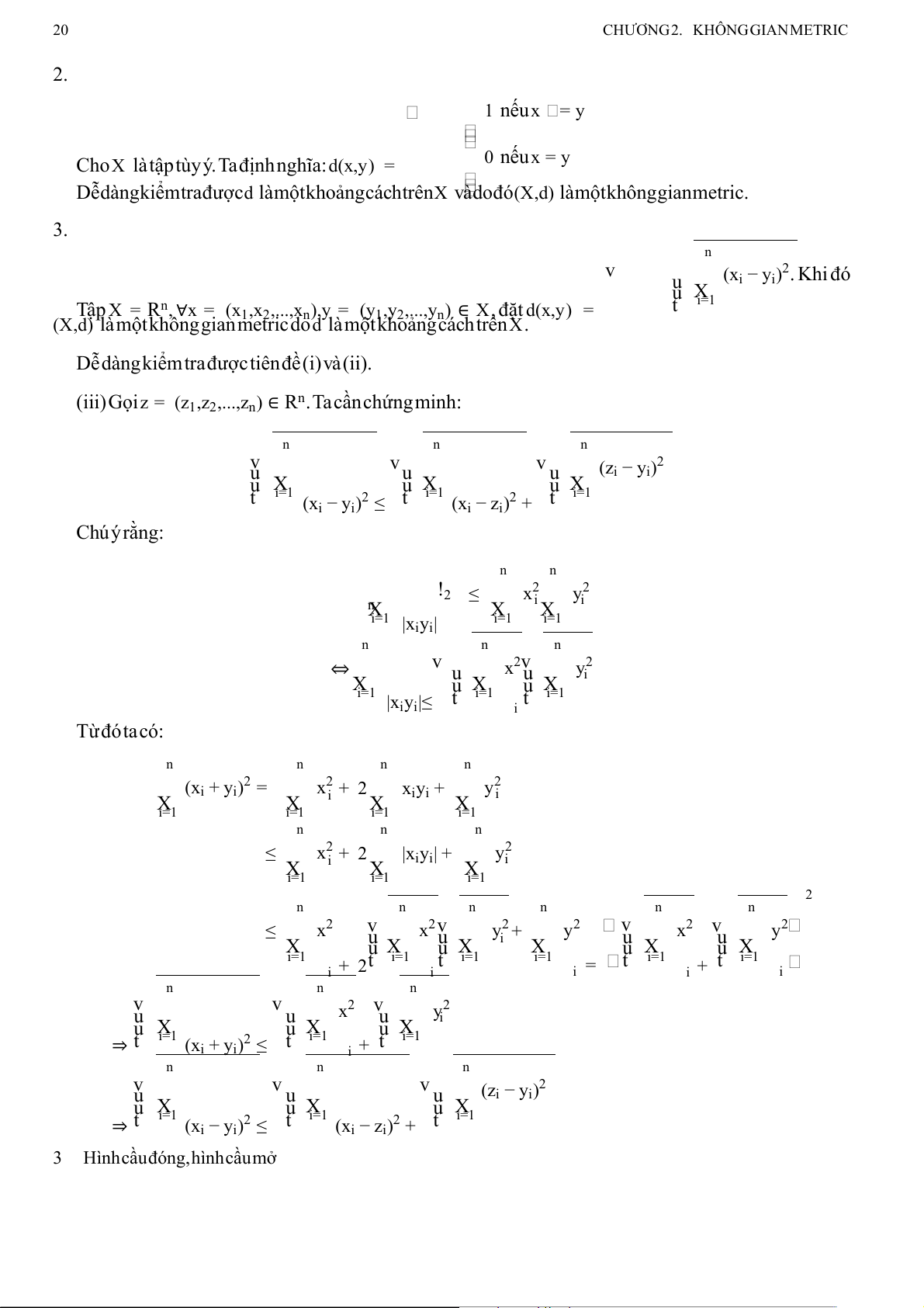 Dễdàngkiểmtrađượcd làmộtkhoảngcáchtrênX vàdođó(X,d) làmộtkhônggianmetric. 3. n v 2 u (xi − yi) . Khi đó u X Tập X = Rn, i=1 ∀x = (x t