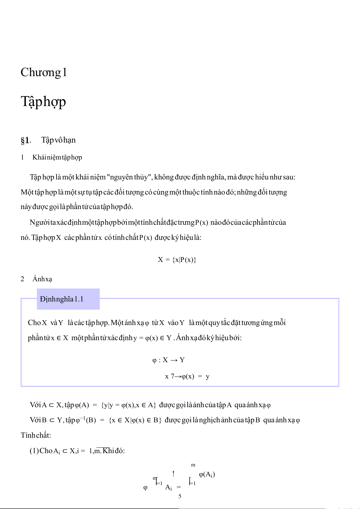 (1)ChoAi ⊂ X,i = 1,m.Khiđó: m ! φ(A m[ [ i) φ i=1 A i=1 i = 5 6 CHƯƠNG1. TẬPHỢP