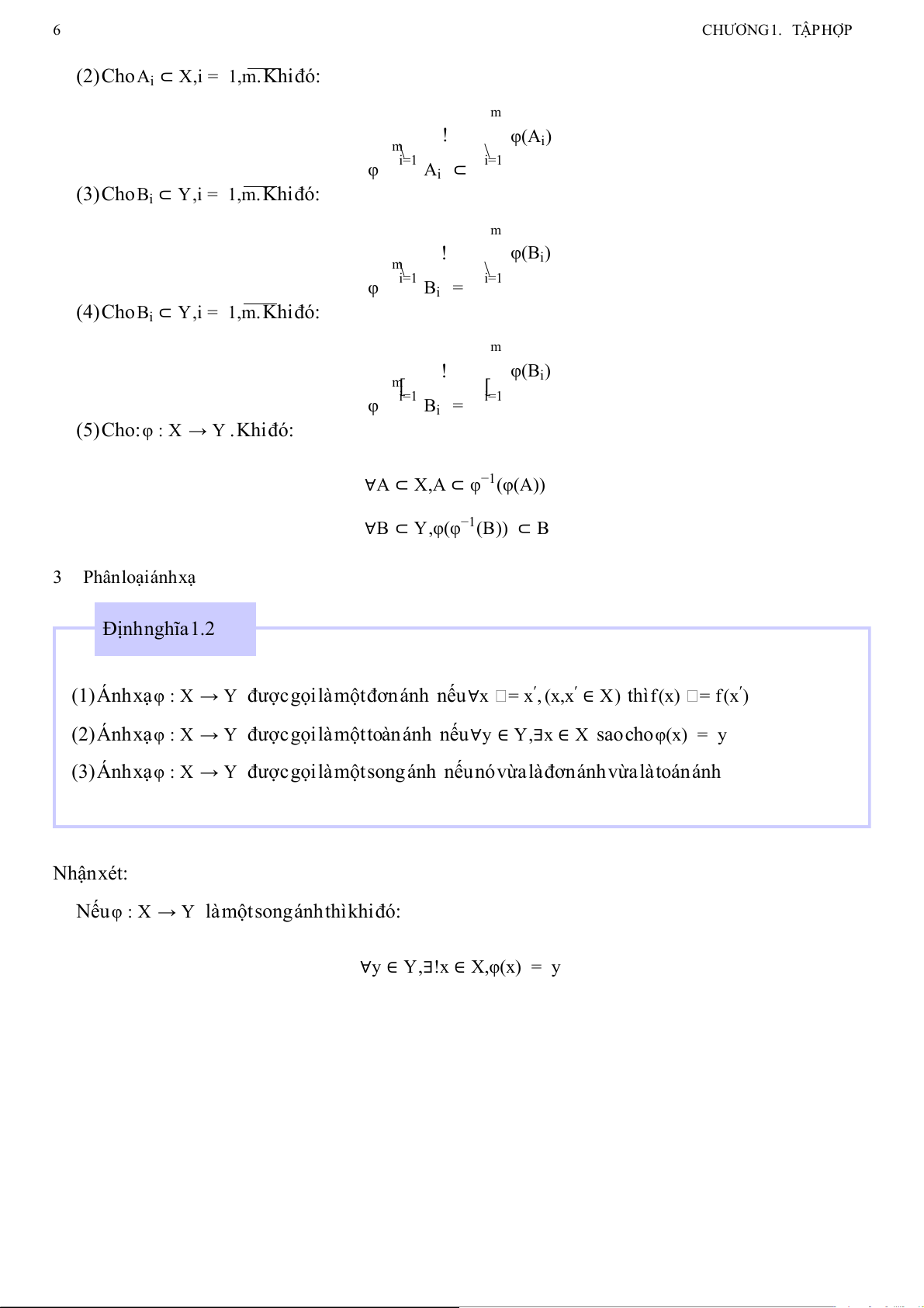 (4)ChoBi ⊂ Y,i = 1,m.Khiđó: m ! φ(B m[ [ i) φ i=1 B i=1 i = (5)Cho:φ : X → Y .Khiđó: ∀A ⊂ X,A ⊂ φ−1(φ(A)) ∀B ⊂ Y,φ(φ−1(B)) ⊂ B 3 Phânloạiánhxạ Địnhnghĩa1.2