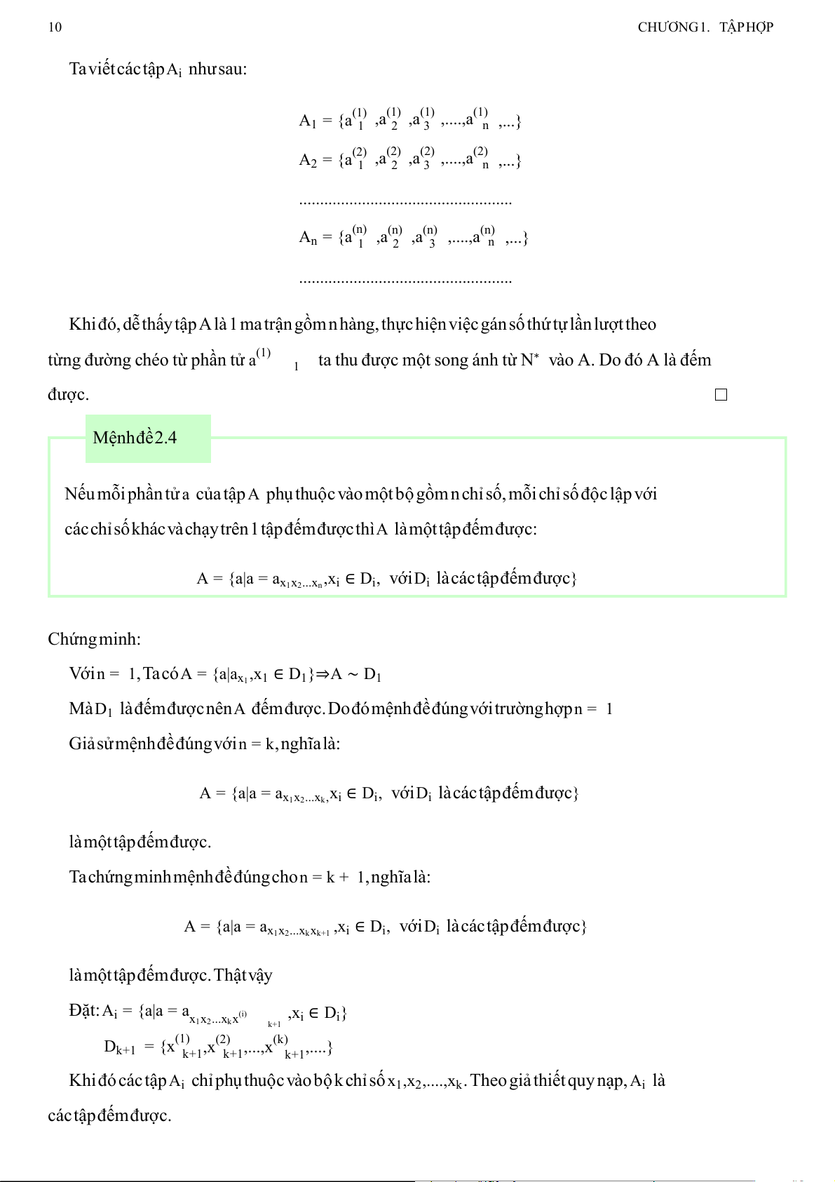tậpđếmđược⇒Hợpcủađếmđượccáctậpđếmđượclàmộttậpđếmđược. Chứngminh: 10 CHƯƠNG1. TẬPHỢP TaviếtcáctậpAi nhưsau: A1 = {a(1)1 ,a(1)2 ,a(1) 3 ,....,a(1)n ,...} A2 = {a(2)1 ,a(2)2 ,a(2) 3 ,....,a(2)n ,...}