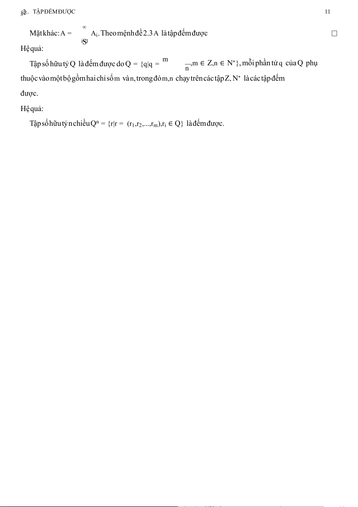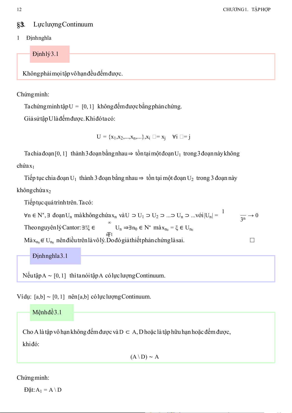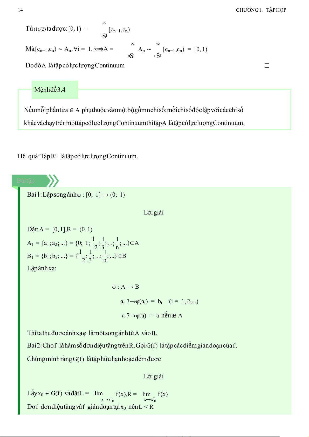 TậpsốhữutỷnchiềuQn = {r|r = (r1,r2,...,rm),ri ∈ Q} làđếmđược. 12 CHƯƠNG1. TẬPHỢP 3. LựclượngContinuum 1 Địnhnghĩa Địnhlý3.1
