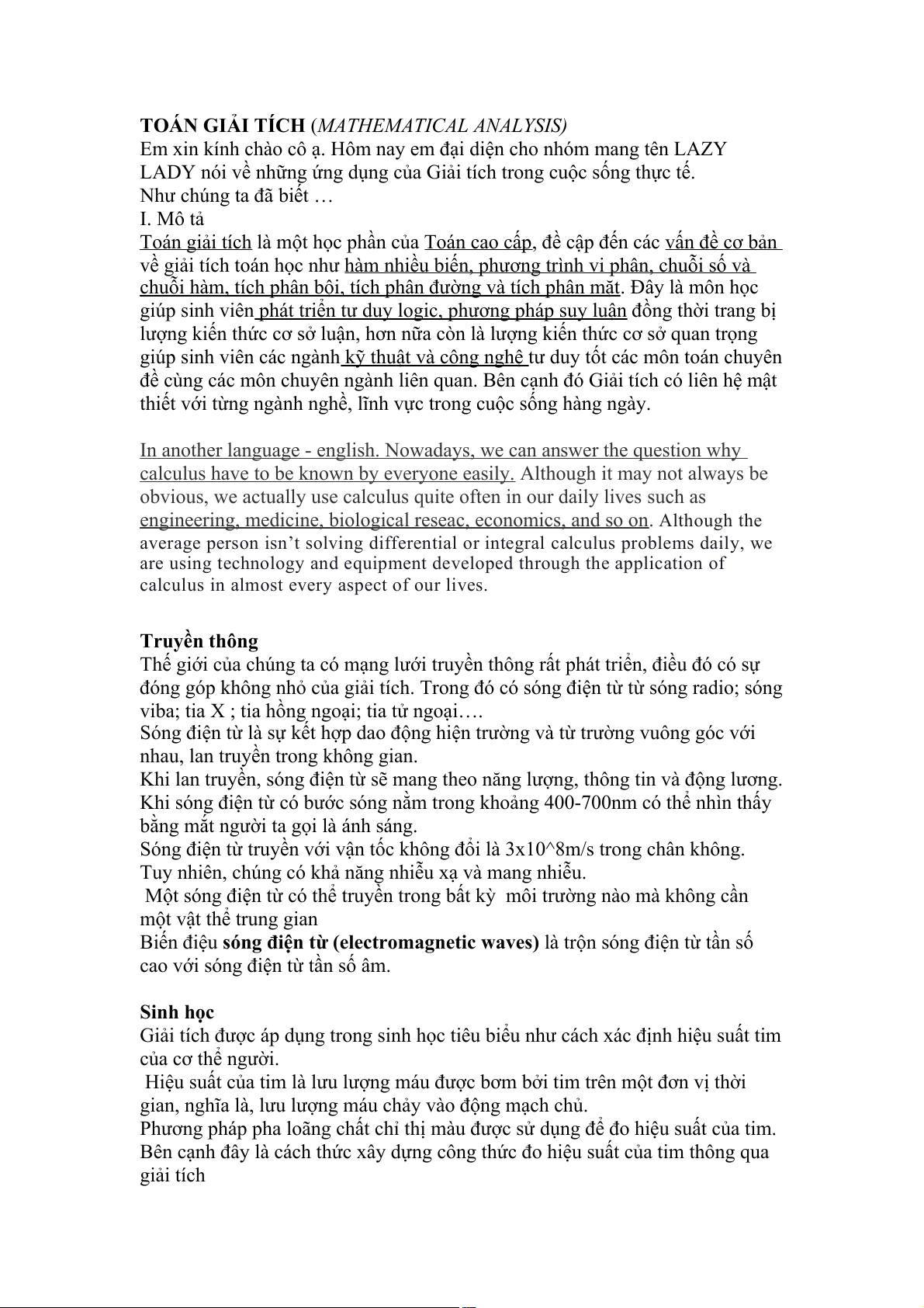 LADY nói về những ứng dụng của Giải tích trong cuộc sống thực tế. Như chúng ta đã biết … I. Mô tả
