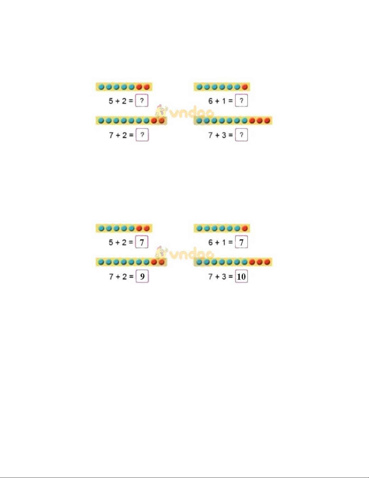 Các em học sinh vận dụng kiến thức đã được học để tính các phép cộng trong phạm vi 10. Lời giải: 8 + 1 = 9 5 + 5 = 10 7 + 1 = 8 6 + 3 = 9 4 + 3 = 7 8 + 2 = 10 9 + 1 = 10 6 + 2 = 8 5 + 3 = 8