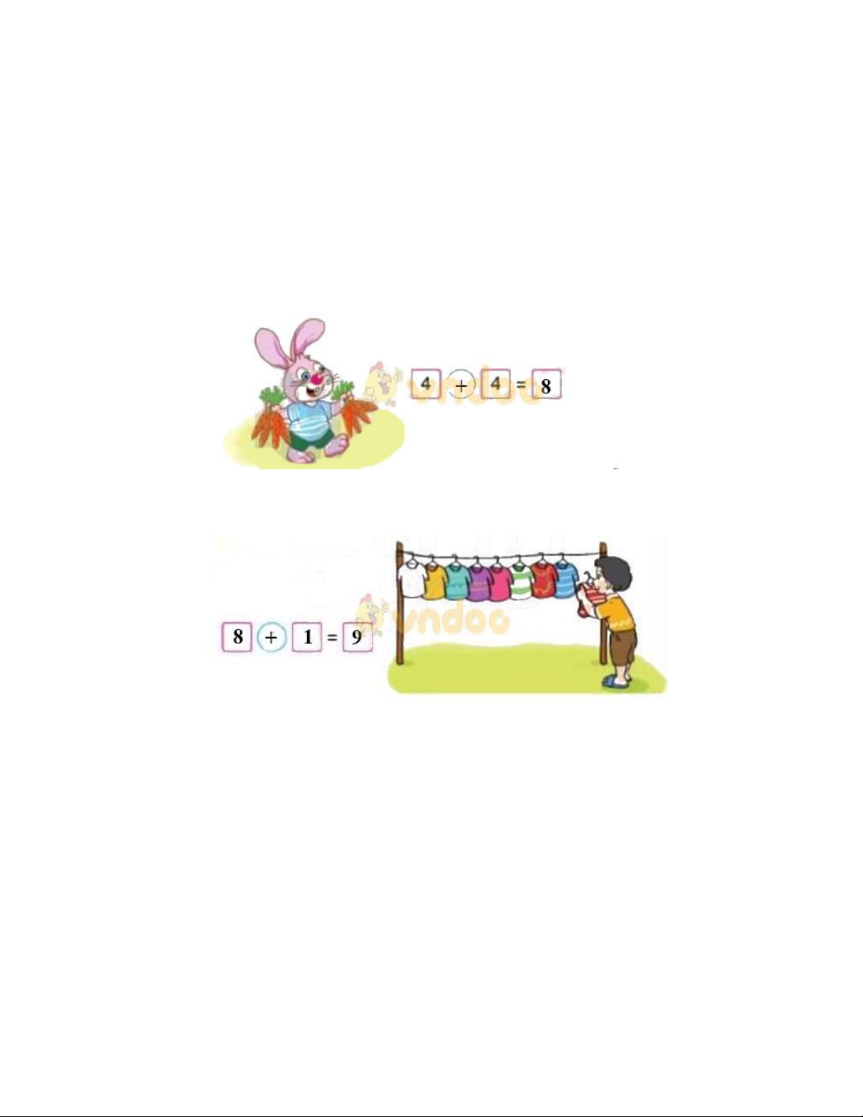 sinh đếm được có tất cả 8 củ cà rốt. Vậy ta có phép tính 4 + 4 = 8 (Bốn cộng bốn bằng tám)