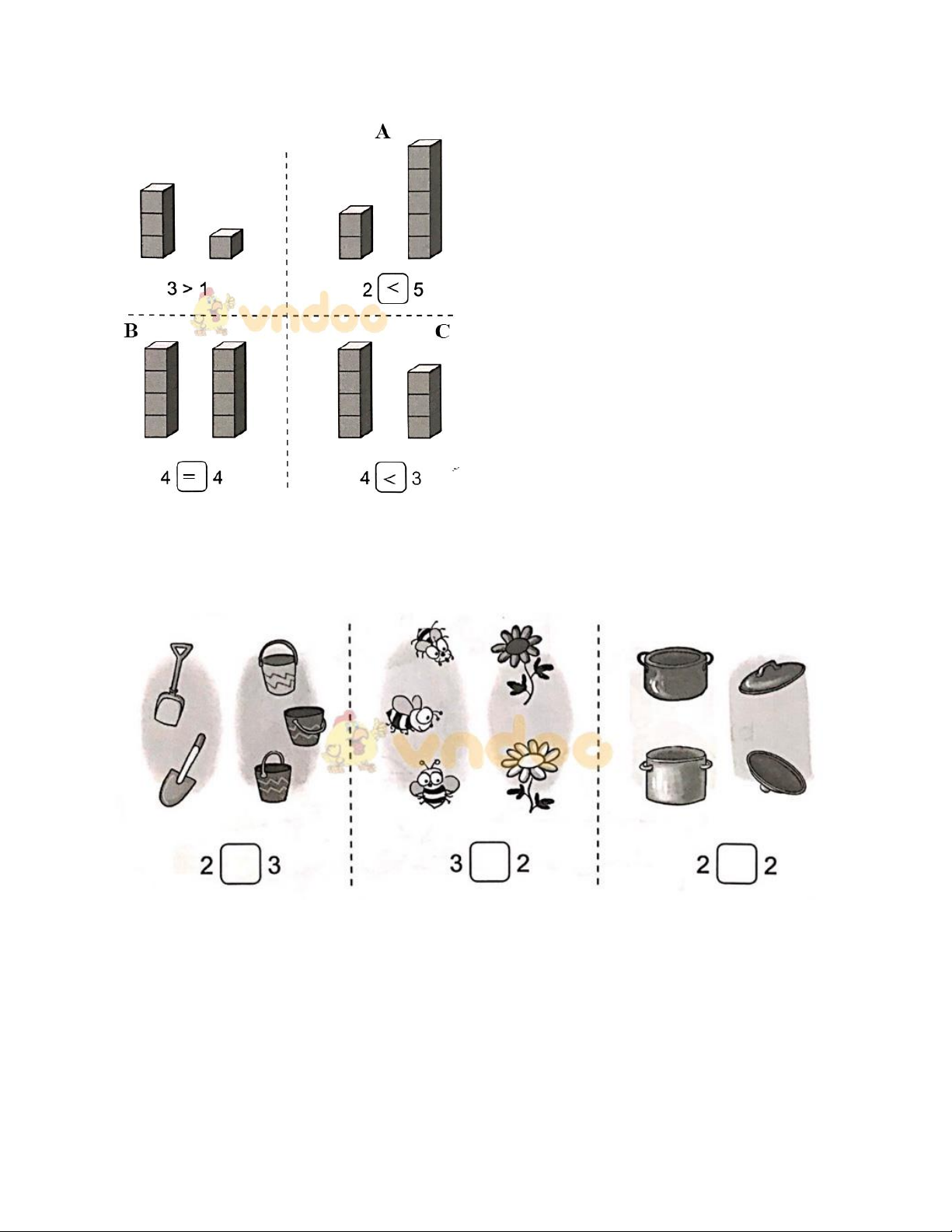 Hình thứ hai có 3 chú ong và 2 bông hoa nên dấu cần điền là “>”