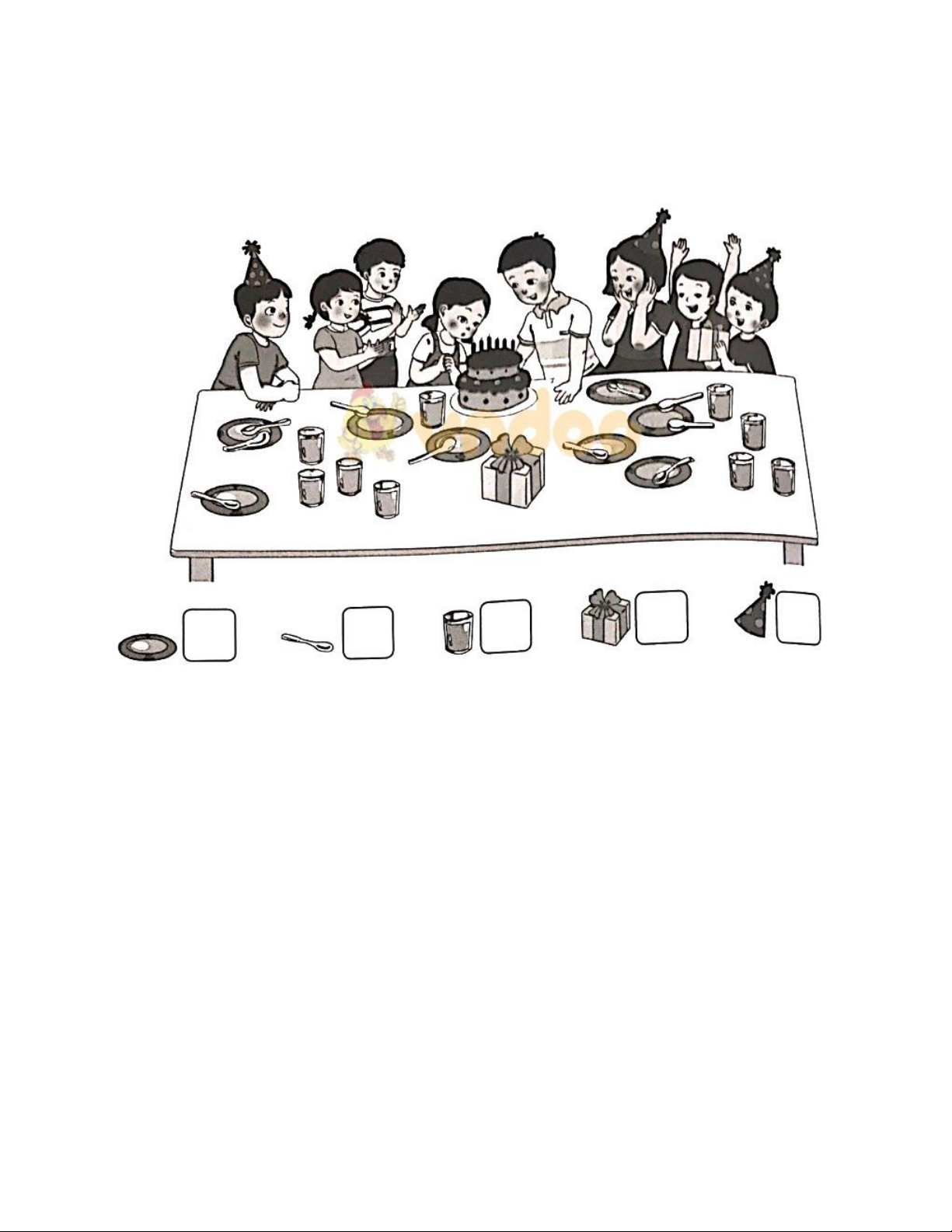 Đếm được có 8 chiếc đĩa, 10 chiếc thìa, 9 chiếc cốc, 2 hộp quà và 3 chiếc mũ.