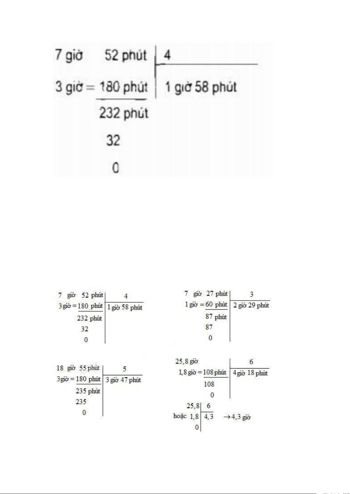 - Khi tính sau mỗi kết quả ta phải ghi đơn vị đo tương ứng. Đáp án Bài 2: Tính (theo mẫu): 7 giờ 27 phút : 3 18 giờ 55 phút : 5 25,8 giờ : 6 Hướng dẫn giải