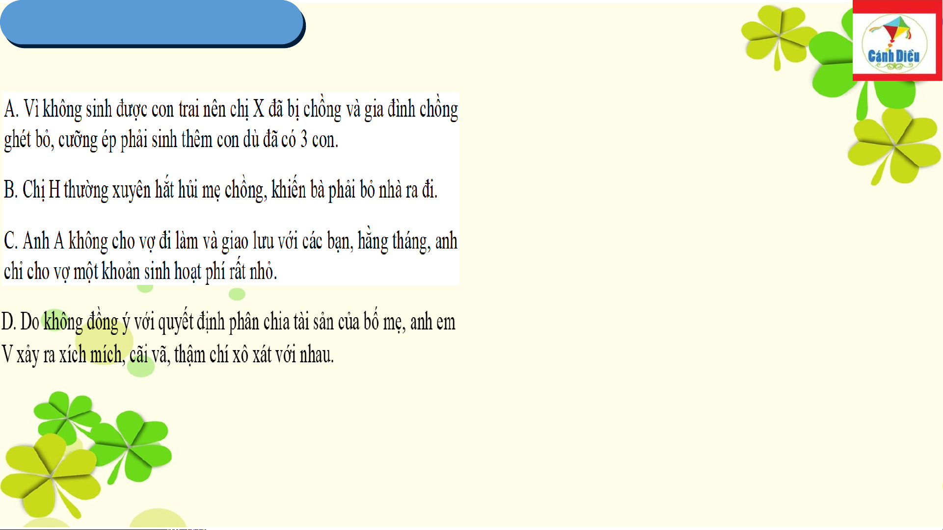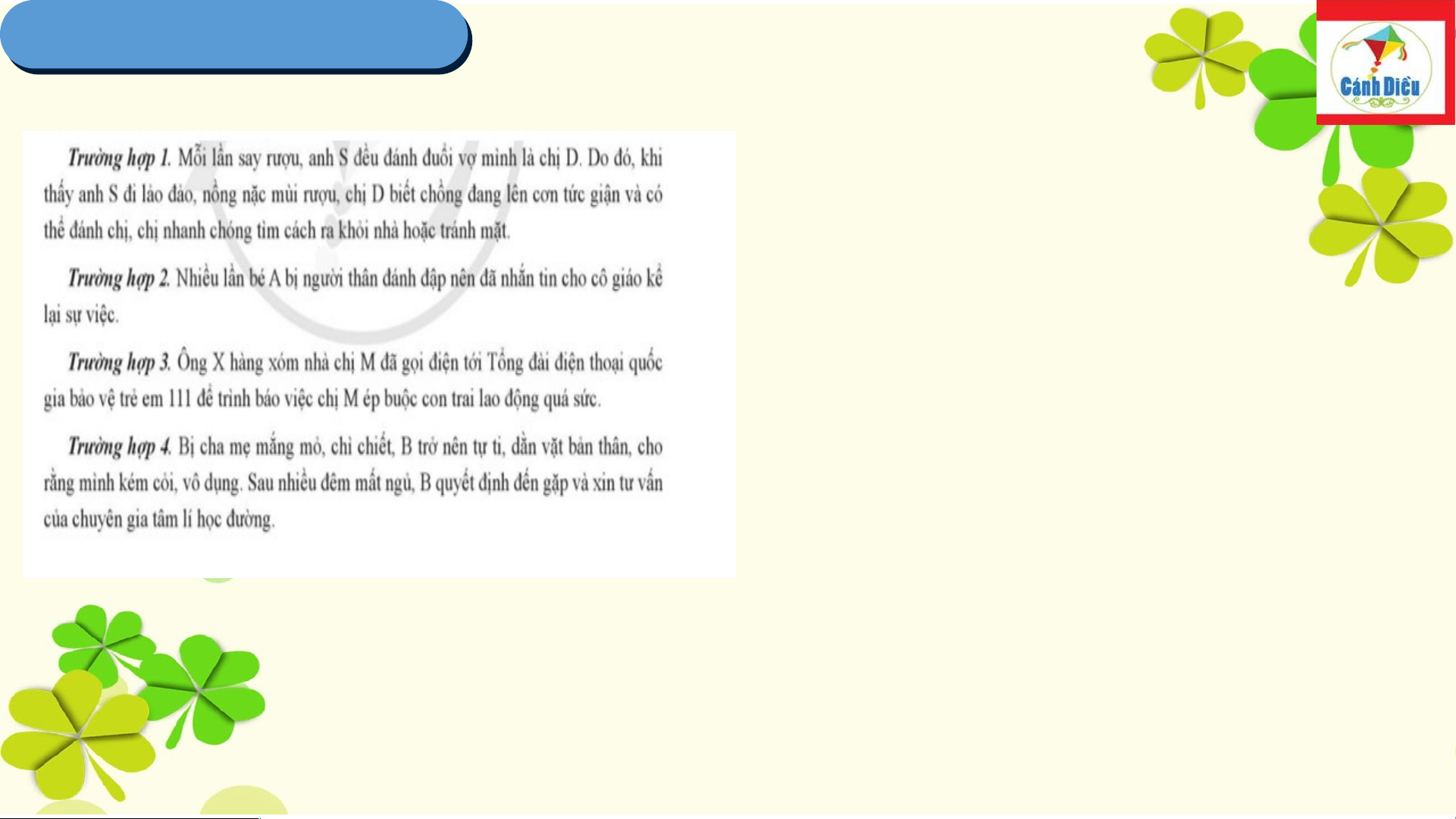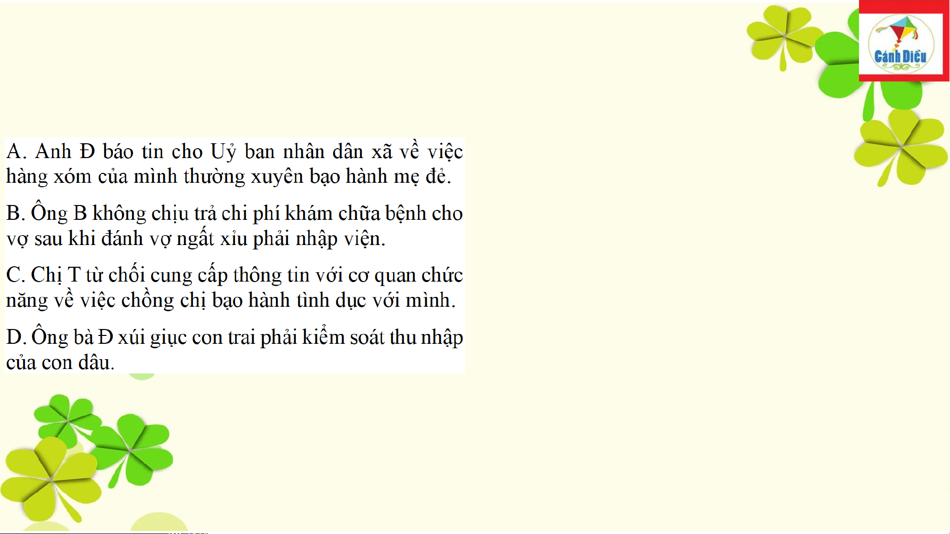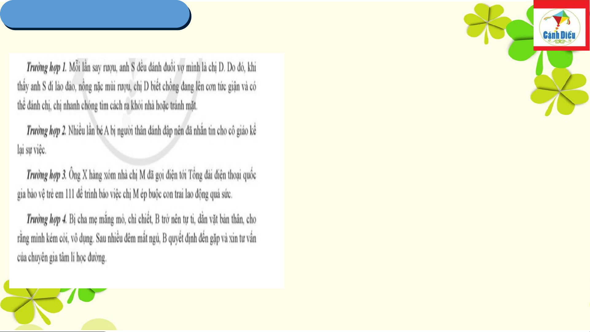 Bài 3: Hãy thảo luận và đưa ra cách ứng phó với bạo lực gia đình c kiế á về chủ đề n t ý â trong các tình huống sau: iế h V n