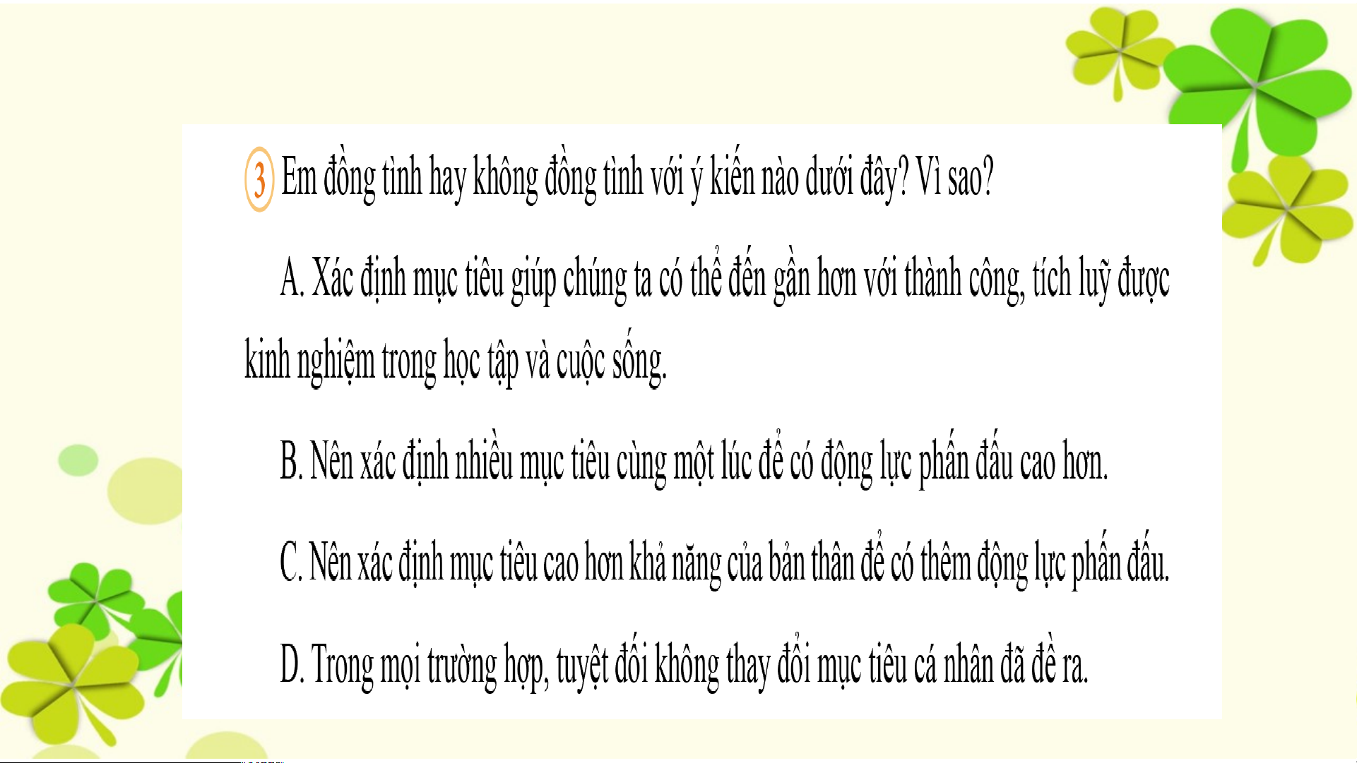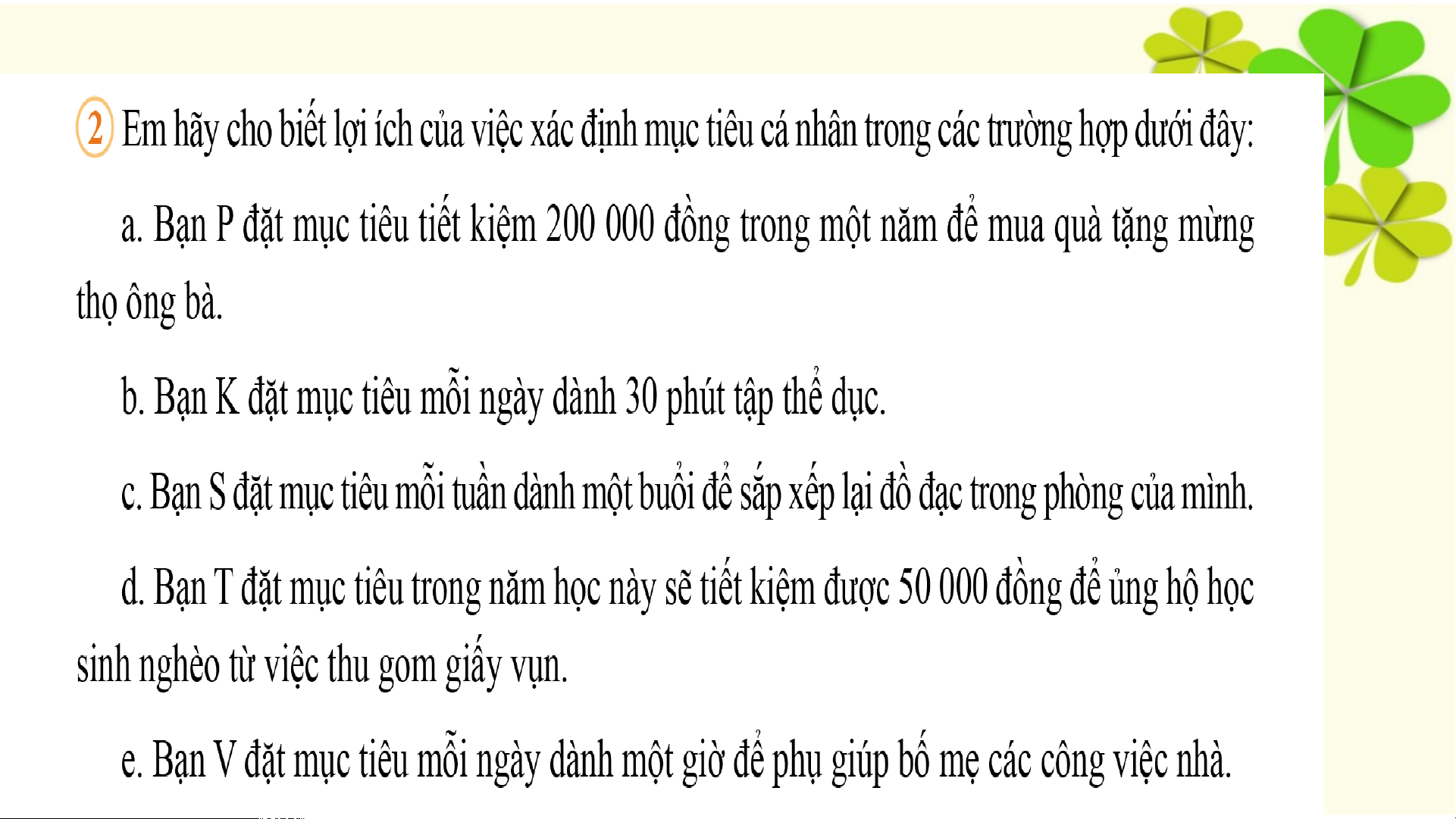 1. Em đã từng thực hiện mục tiêu cá nhân nào chưa?