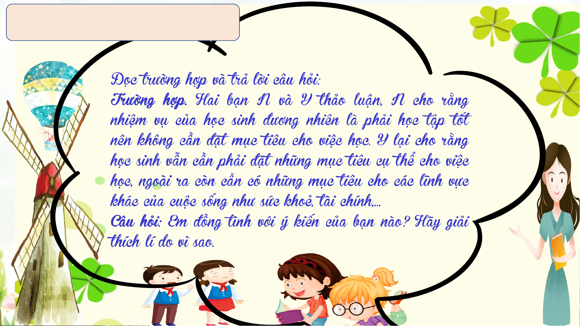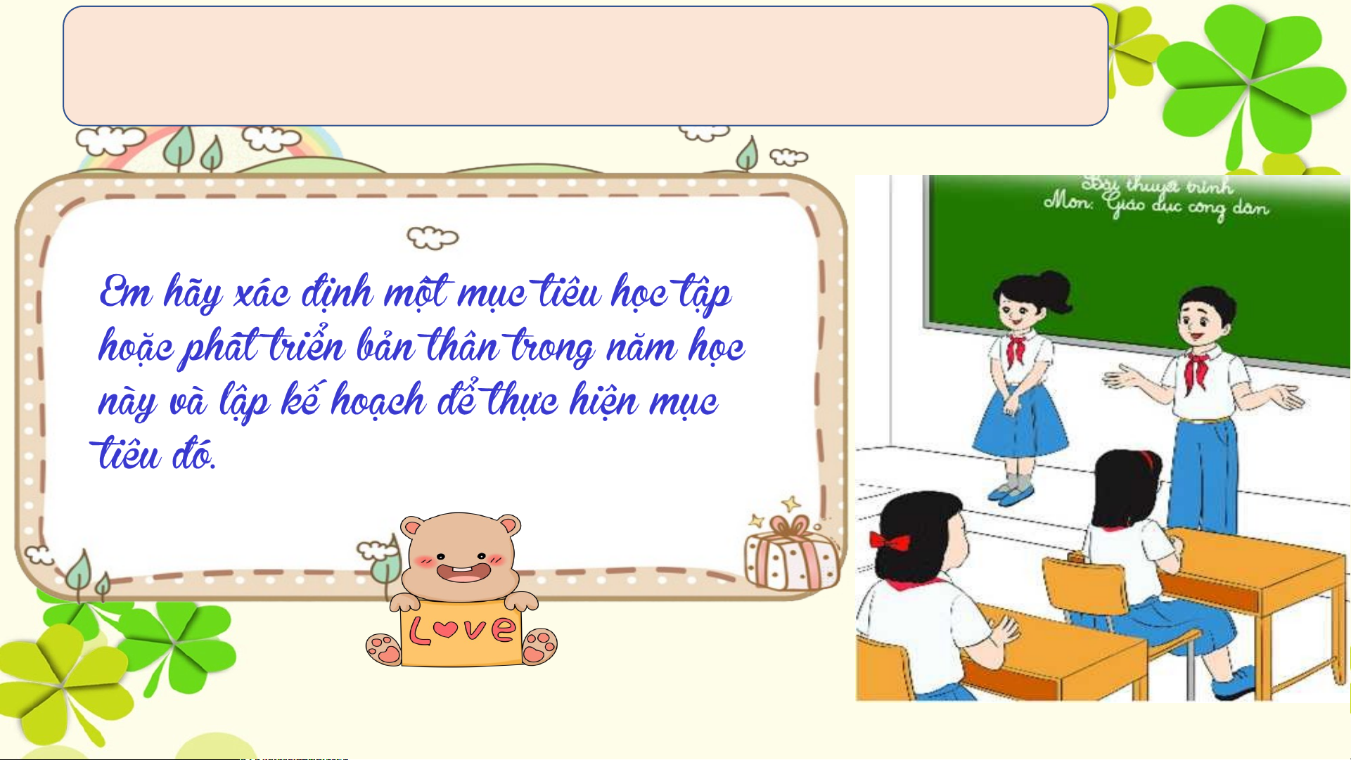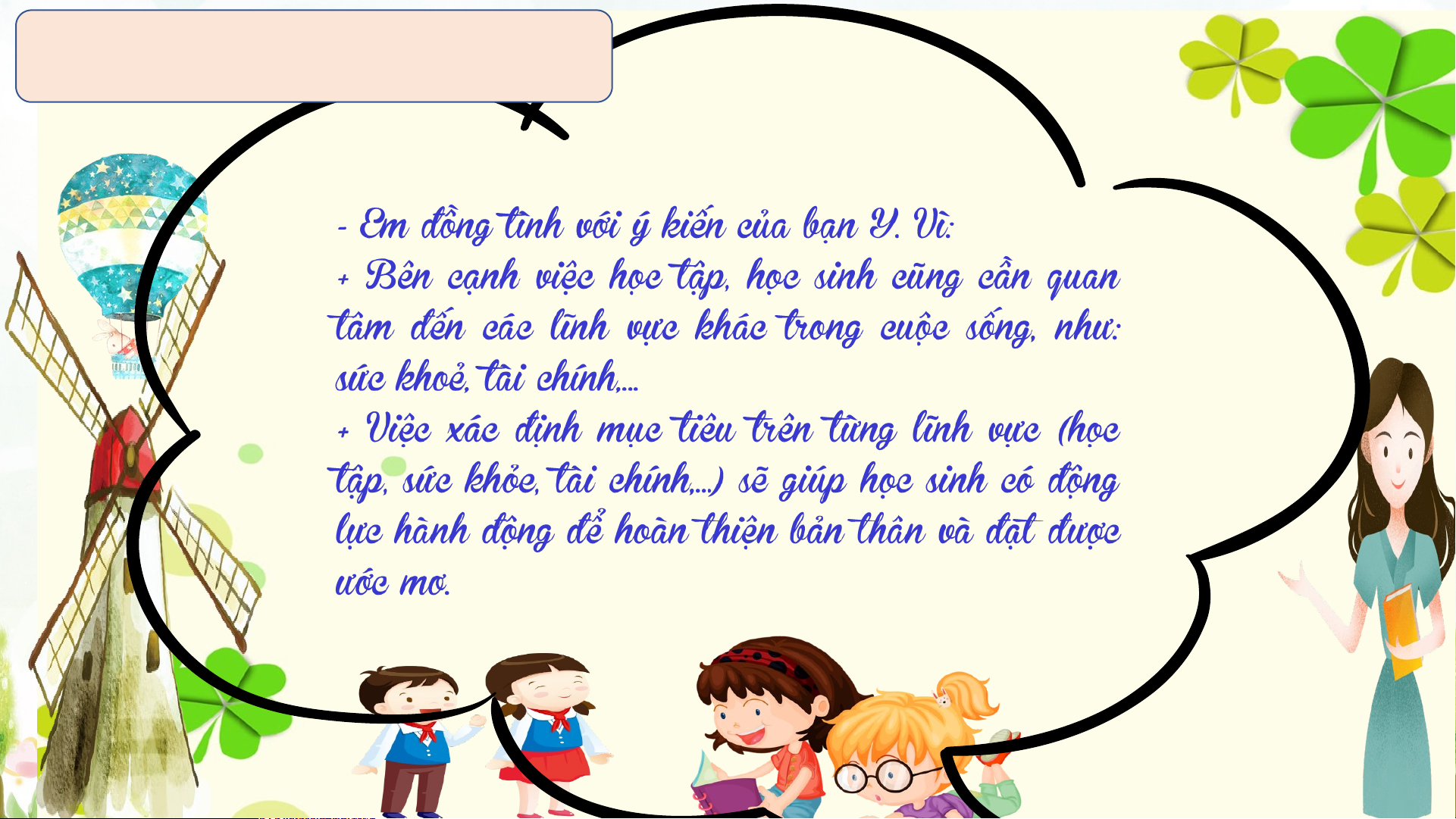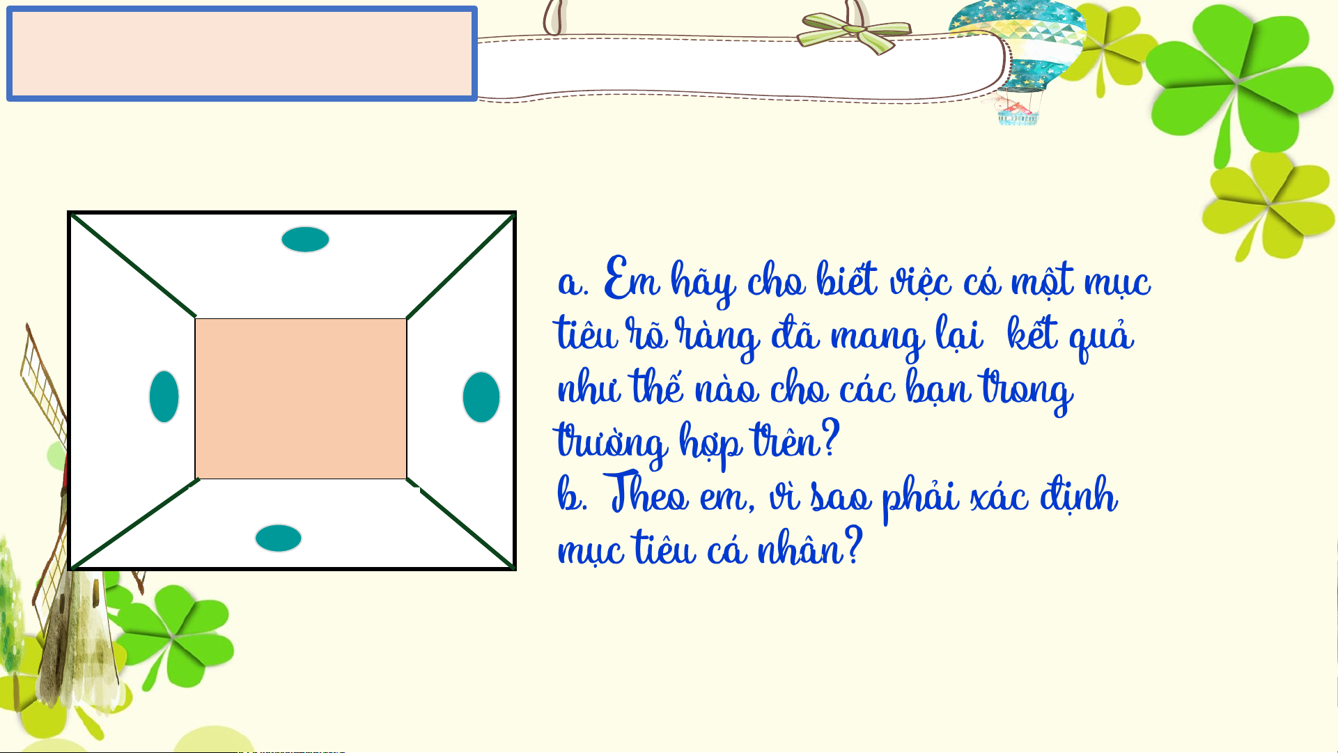 2. Sự cần thiết phải xác định mục tiêu cá nhân GÓC CHIA SẺ THẢO LUẬN THEO BÀN 1 n V Viết ý kiến cá h iế â nhân t n ý k cá i Ý kiến chung n ế 4 n của cả nhóm 2 c kiế á về chủ đề n t ý â iế h V n Viết ý kiến cá nhân 3 GÓC CHIA + Câu hỏi a: