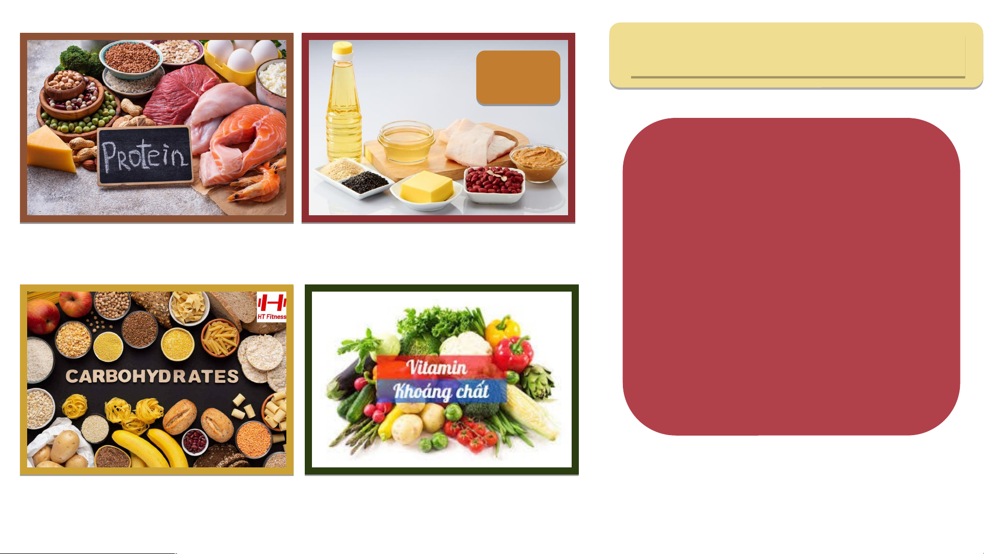 Thực phẩm giàu chất đạm béo + Chất béo (lipit). + Chất bột, đường (cacbohydrat). + Vitamin và muối khoáng. + Chất xơ, …..