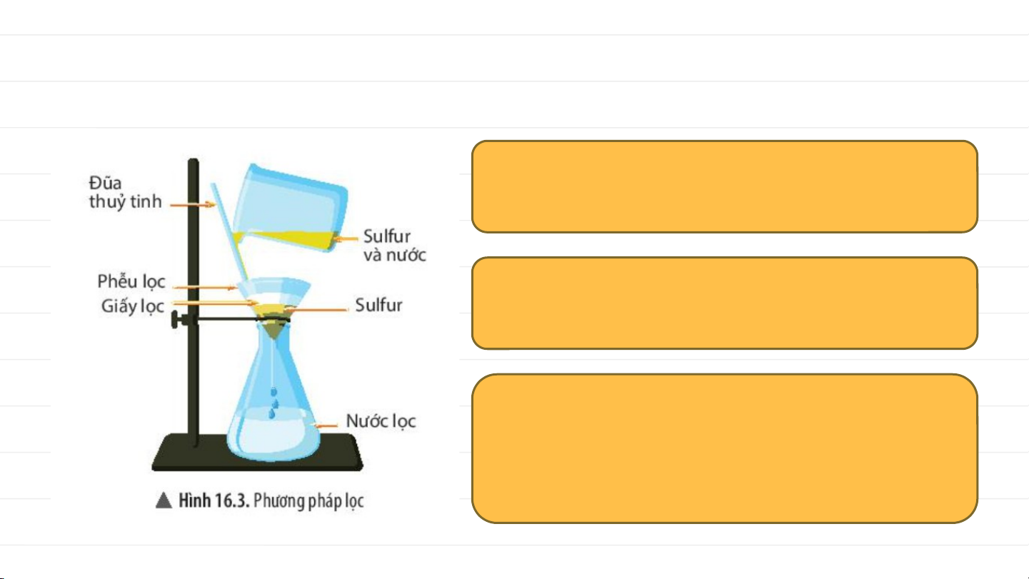 - Sunfur: chất rắn không tan trong nước => Dùng phương pháp lọc Giá sắt có kẹp Phễu thuỷ tinh Giấy lọc Dụng cụ Đũa thuỷ tinh Cốc thuỷ tinh Bình tam giác