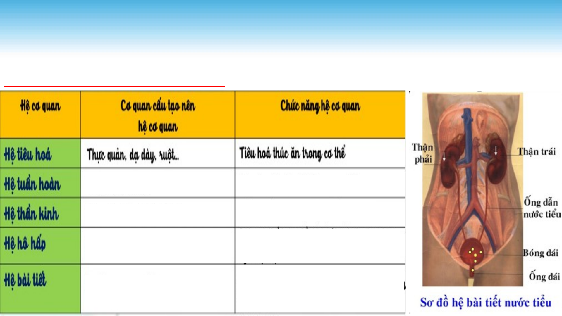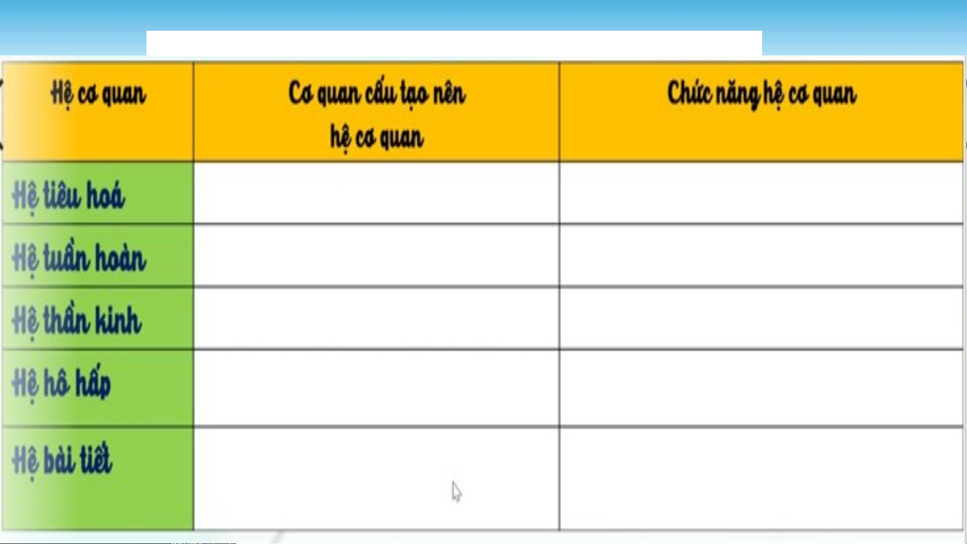 - Hệ cơ quan là tập hợp một số cơ quan cùng hoạt động để thực hiện một chức năng nhất định.