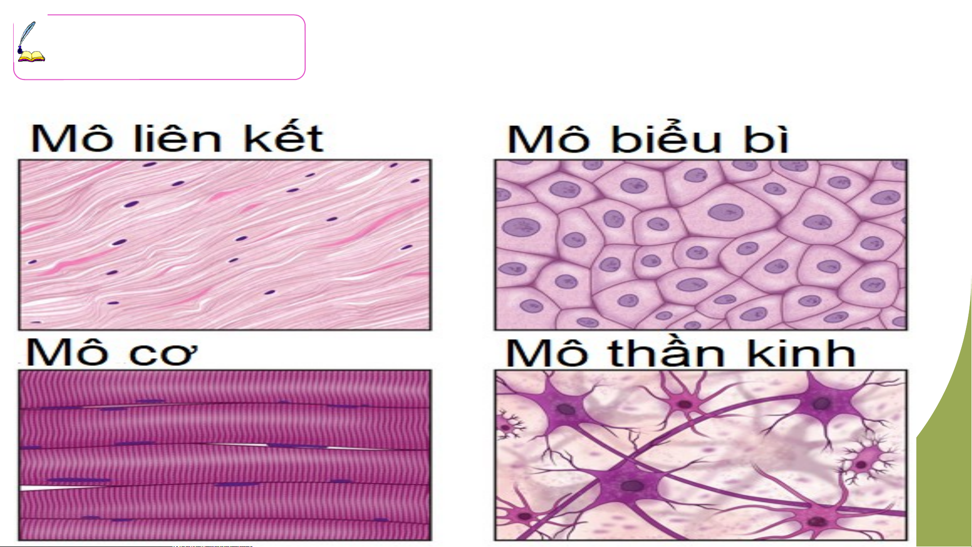 - Mô động vật gồm : mô biểu bì, mô liên kết, mô thần kinh, mô cơ.