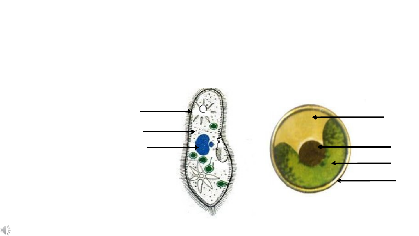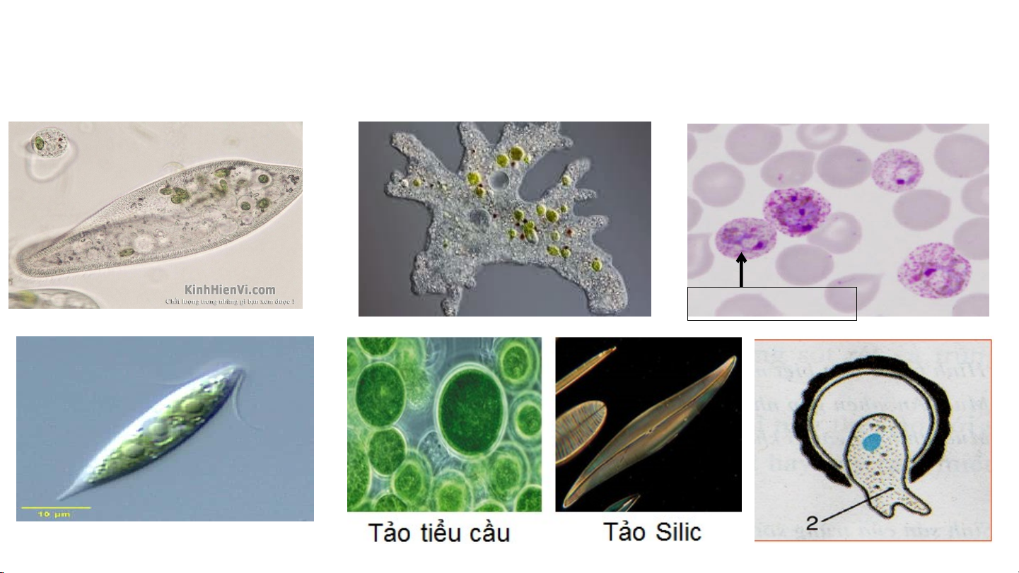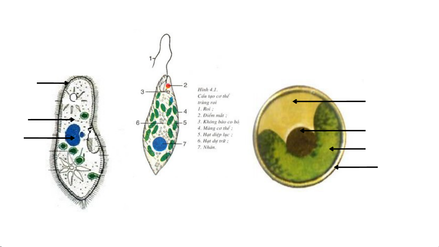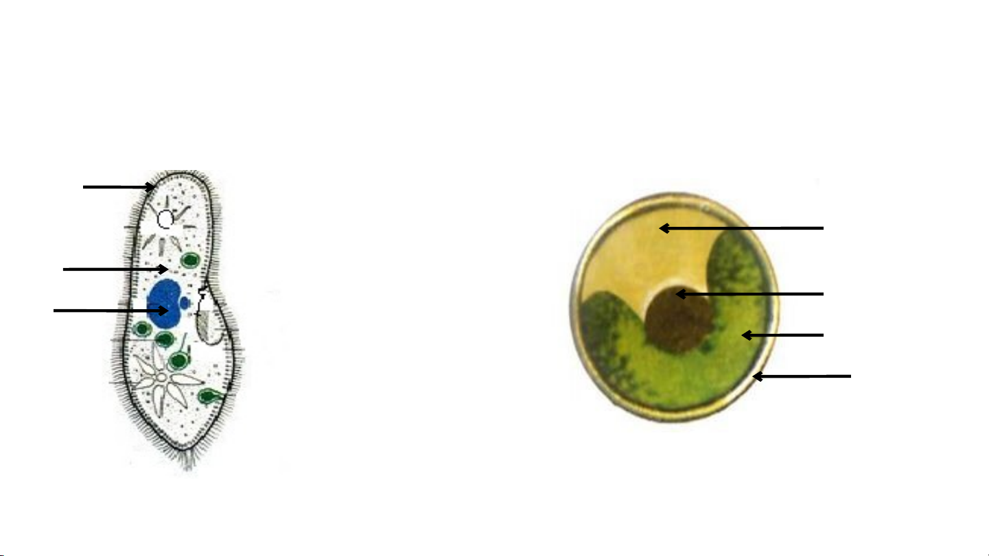 b) Tảo lục đơn bào 2. Chất tế bào a) Trùng giày 3. Nhân 4. Diệp lục