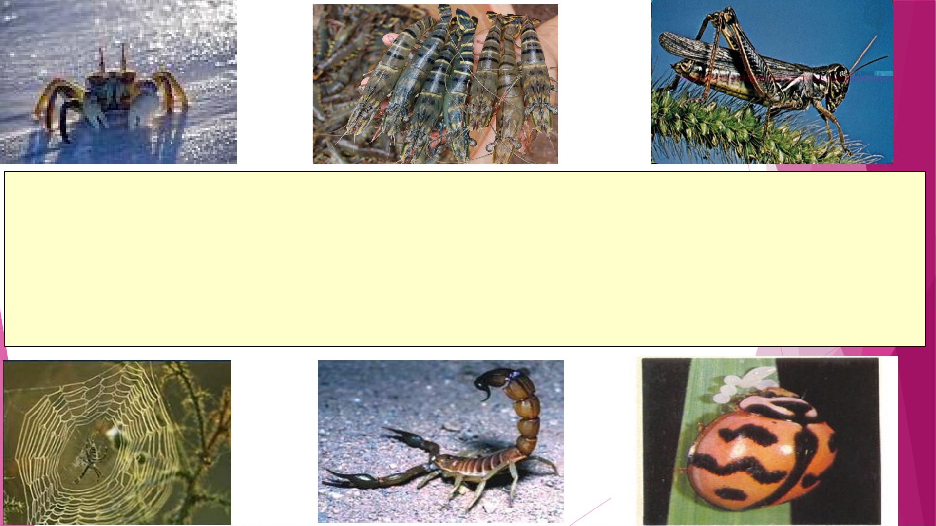 - Đại diện: Nhện, gián, bọ xít, ong, kiến, bướm, tôm, cua.