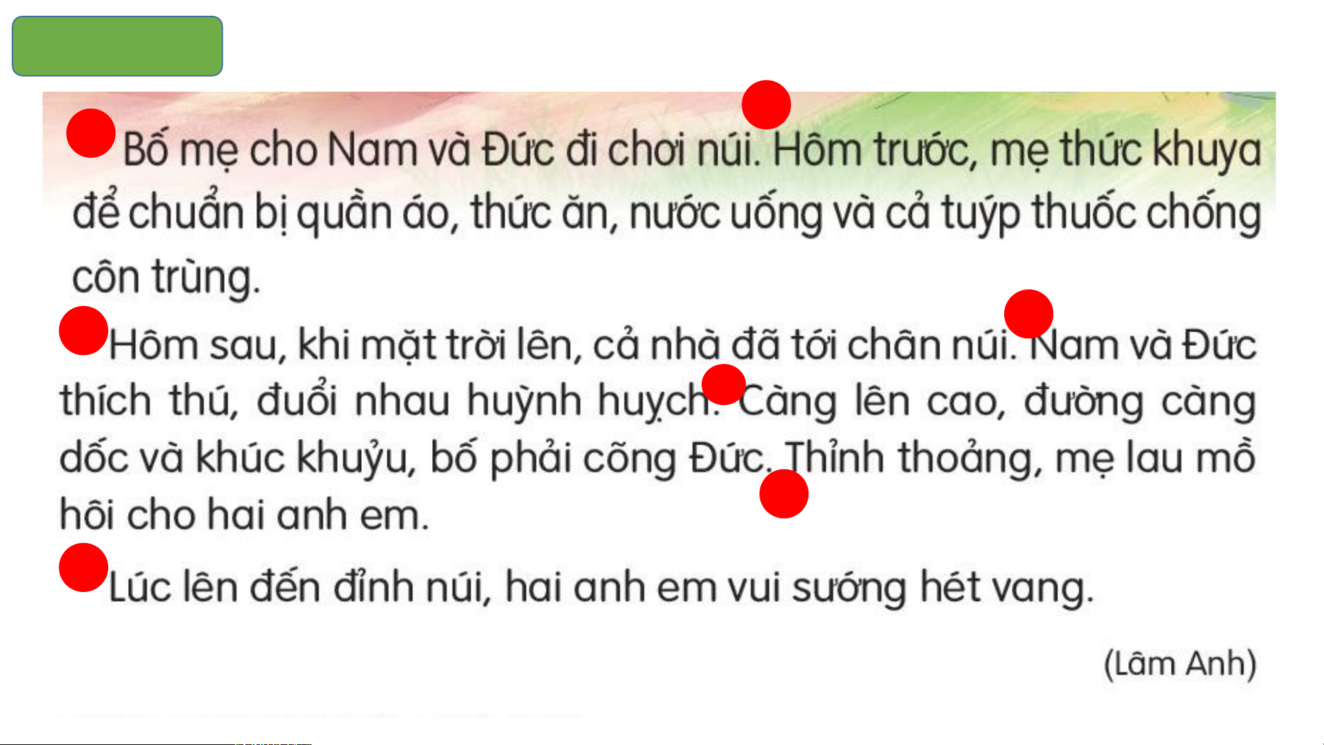 Càng lên cao, đường càng dốc và khúc khuỷu, bố phải cõng Đức 1 2 3 2. Đọc 2 1 3 4 5 6 7 3. Tr¶ lêi c©u hái aa.. N N a a m m v v à à Đ Đ ức ứ đ c đ ượcư ợ bố c b mẹ ố mẹ cho đi đâu? cho đi chơi núi. b. b M . ẹ M ch ẹ uẩn chubị ẩ n n hữ b ng ị n gì ch hiều o chu thứ y ến đi? cho chuyến đi như: