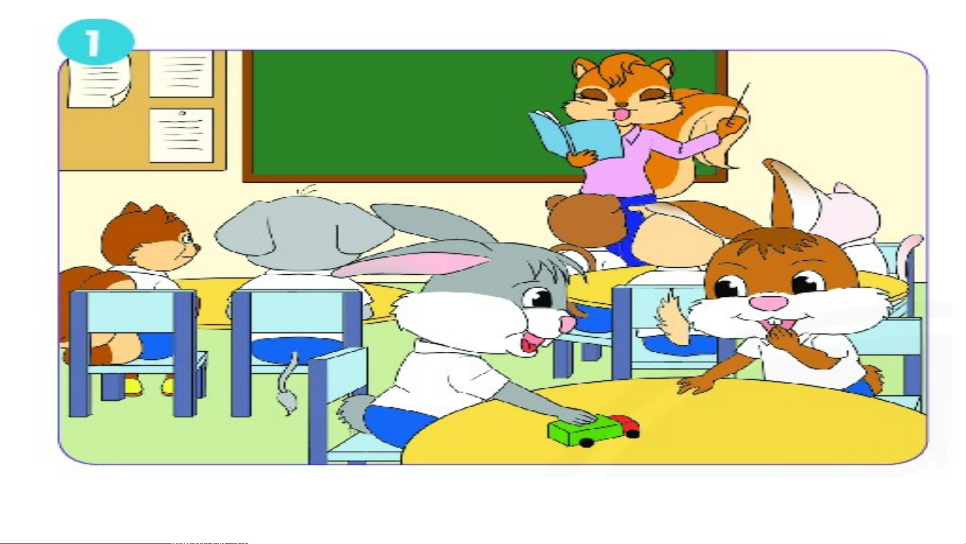 Cô giáo, bạn nhỏ,bút mực, bút chì, hộp bút.
