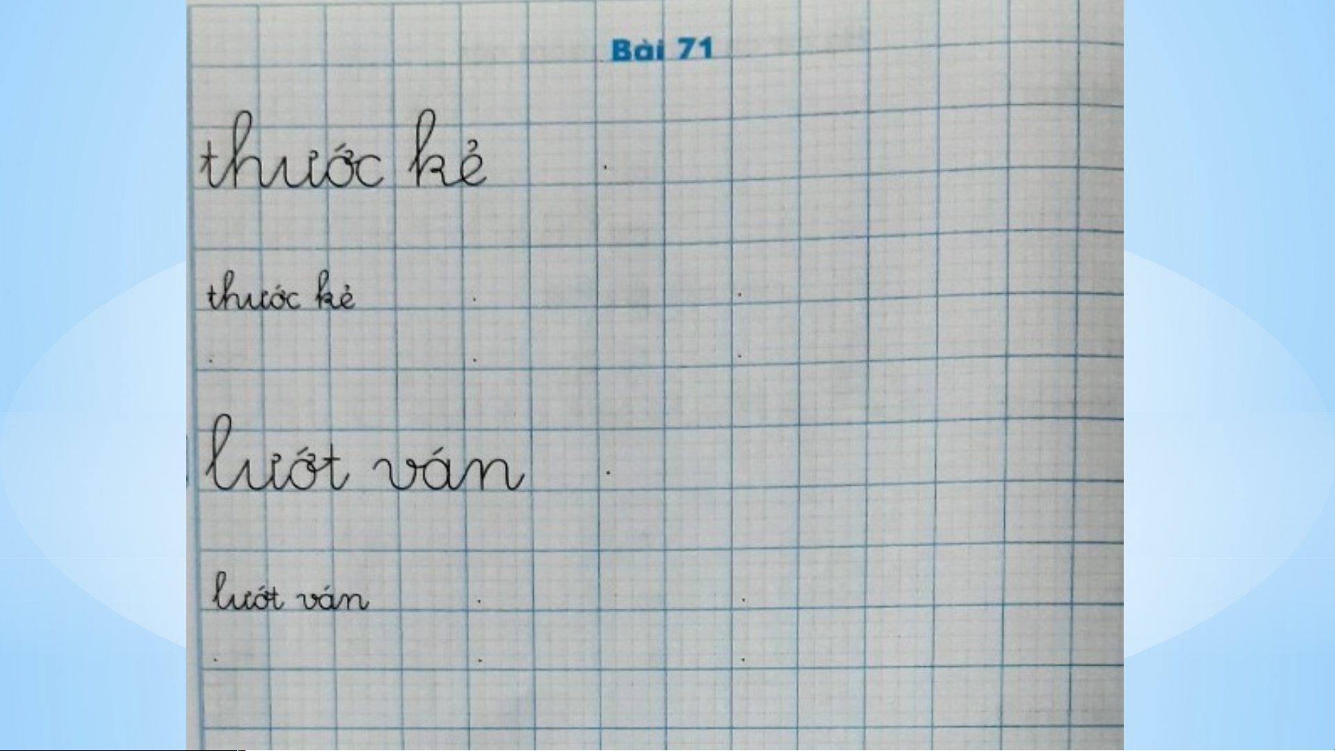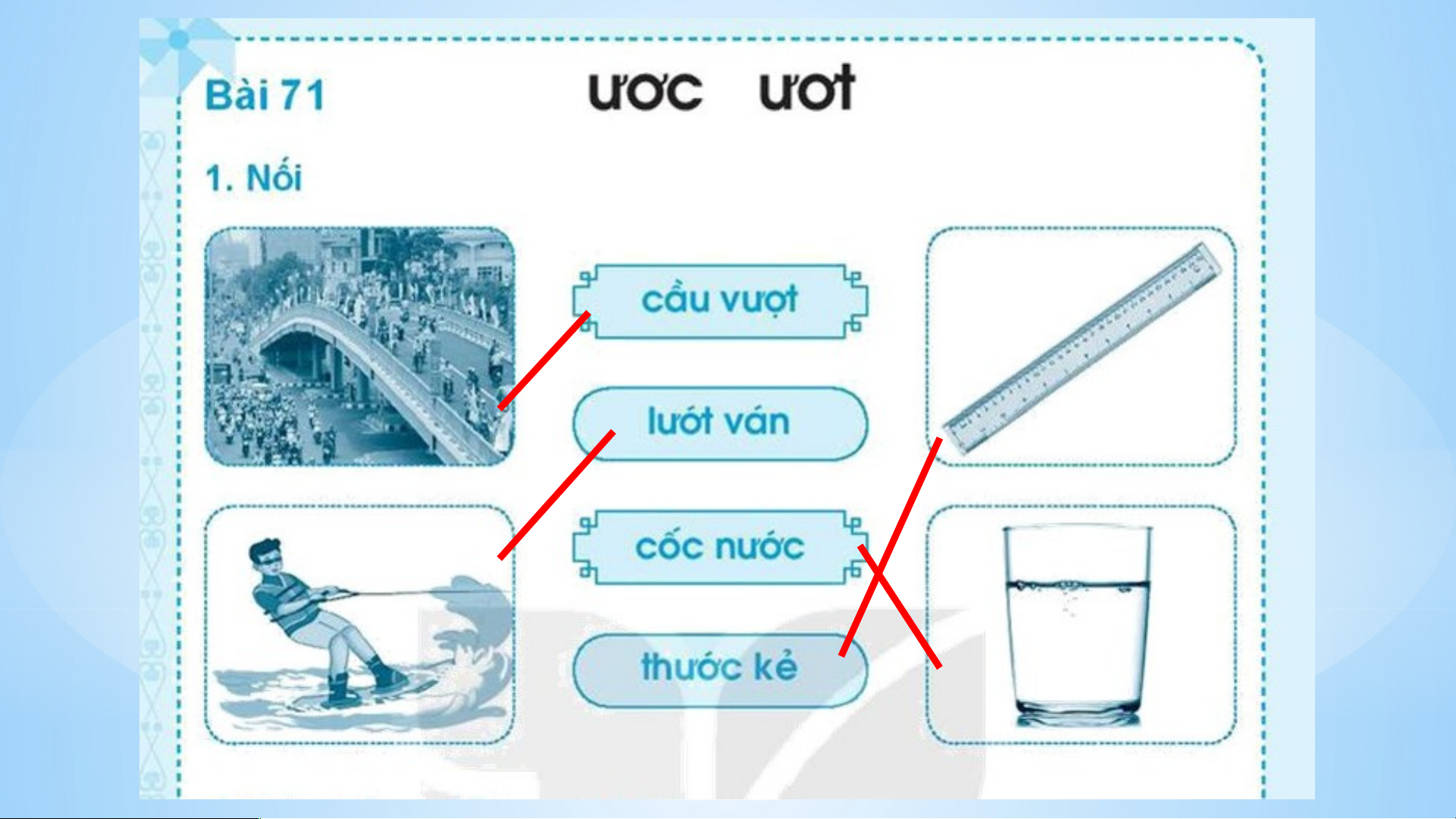 - Phát triển kĩ năng nói về ước mơ của bản thân. KHỞI ĐỘNG cưỡi ngựa vuốt ve v trẻ thơ nhuộm vải lem luốc nướu ră r ng ă luống cuống lu muôn màu u KHÁM PHÁ KHÁM 1 Nhận biết Hà ước ươc đượ ư c lướt ơc ươt sóng biển. Bài 71: ươc ươt 2 Đọc ươc ươt đ ươc đ ươ ược bước ươ lượ ươc ngượ ươc nướ ươc lướt ươ lượ ươt mướ ươt mượt ươ Thước kẻ ươc dược sĩ ươc lướt ván ươt ươc 2 Đọc ươt đ ươc được ươc bước lược ngược nước lướt lượt mướt mượt thước ươc dược s ươc ĩ lướt ươ ván t THỰC HÀNH (Tiế T t 2) 3. Luyện viết 11 THỰC HÀNH (Tiế T t 2) 4 Đọc 4 Đọc