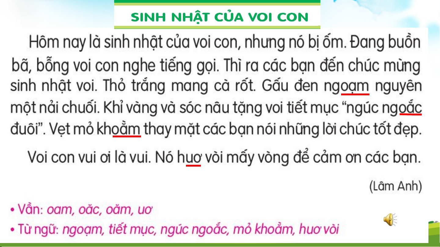 vòng để cảm ơn các bạn. (Lâm Anh) Tiết 2 3 Trả lời câu hỏi a. b c. . N Vh o Sinững i c h o bạn n là nhật c nà m g ủa o ì đến để voi cả co dự m n s ơ inh n c như t á hnhậ c ế t bạ nà của n? o voi con? 4 Viết vào vở