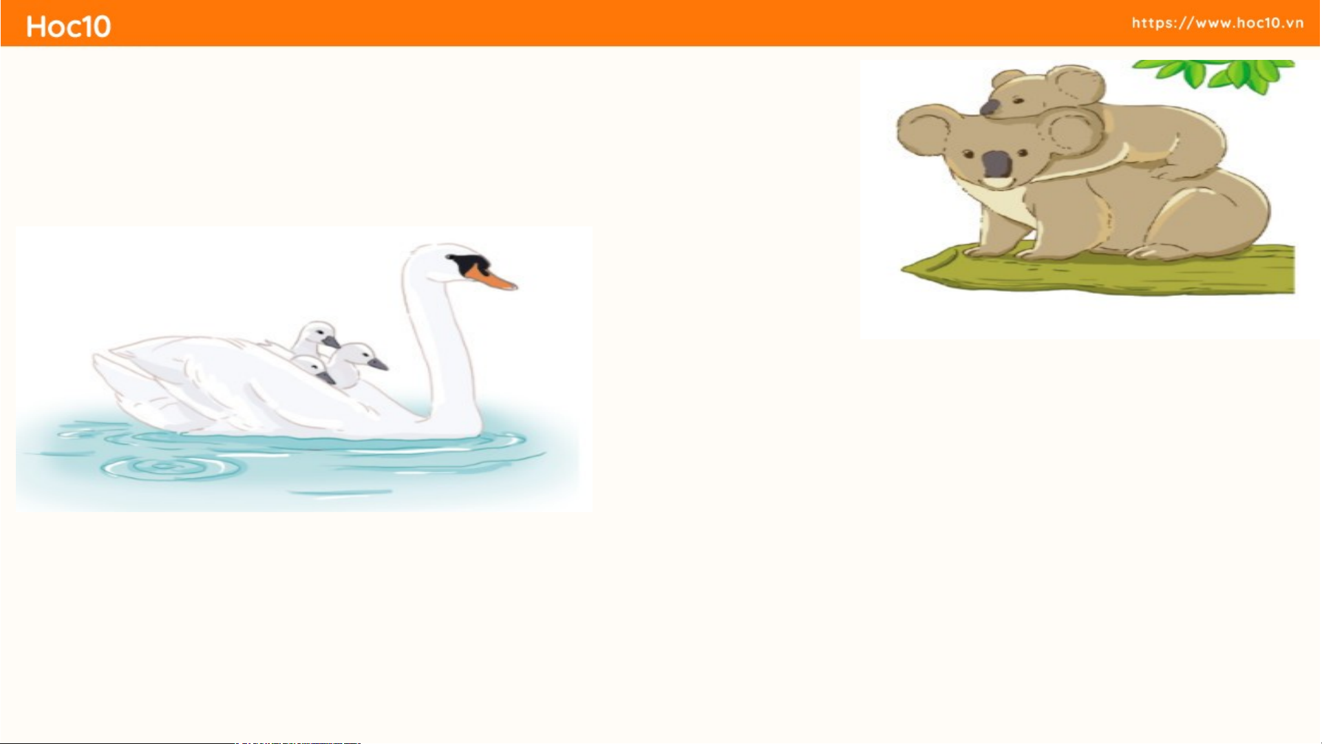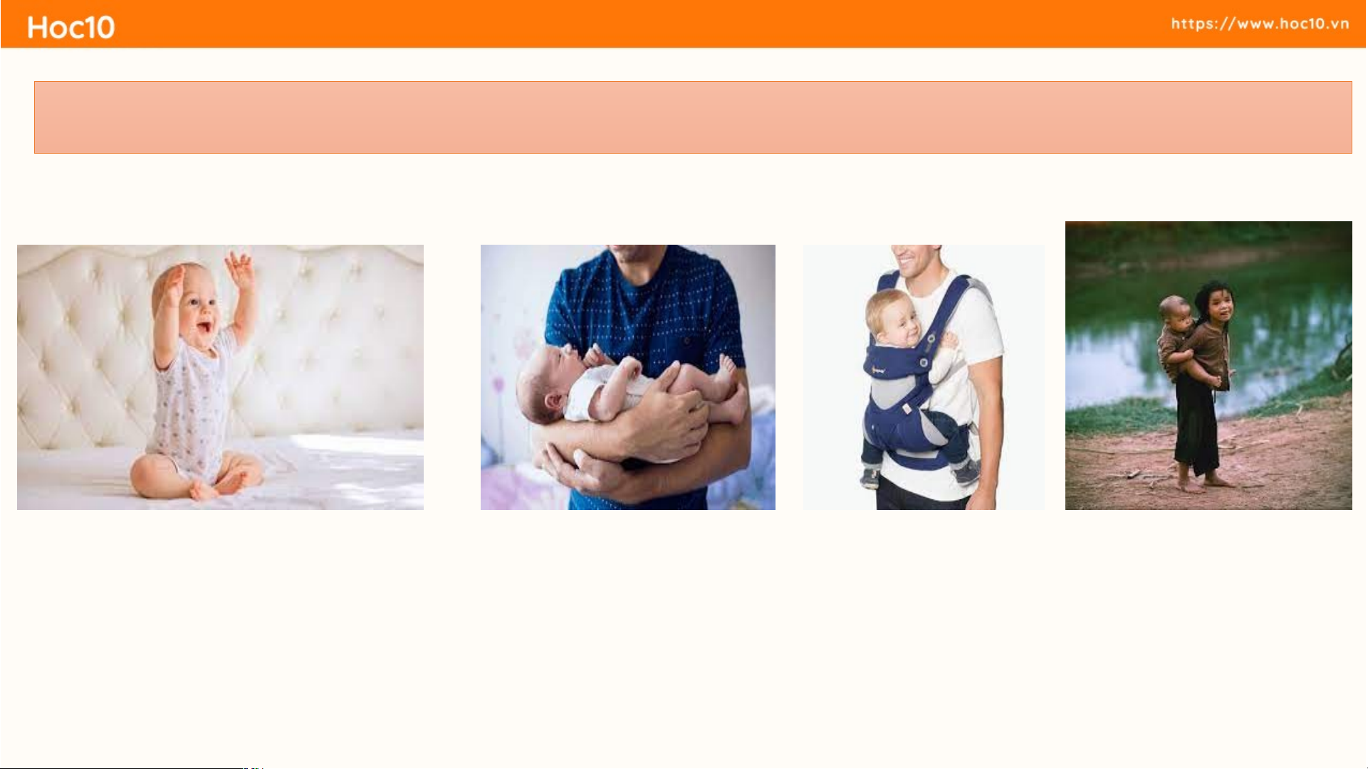 Con người giúp em bé di chuyển bằng cách nào? 13 2 Cá sấu tha từng đứa con miệng 3 Chuột túi, gấu túi địu túi da ở trước bụng 4 Thiên nga cõng lưng 14