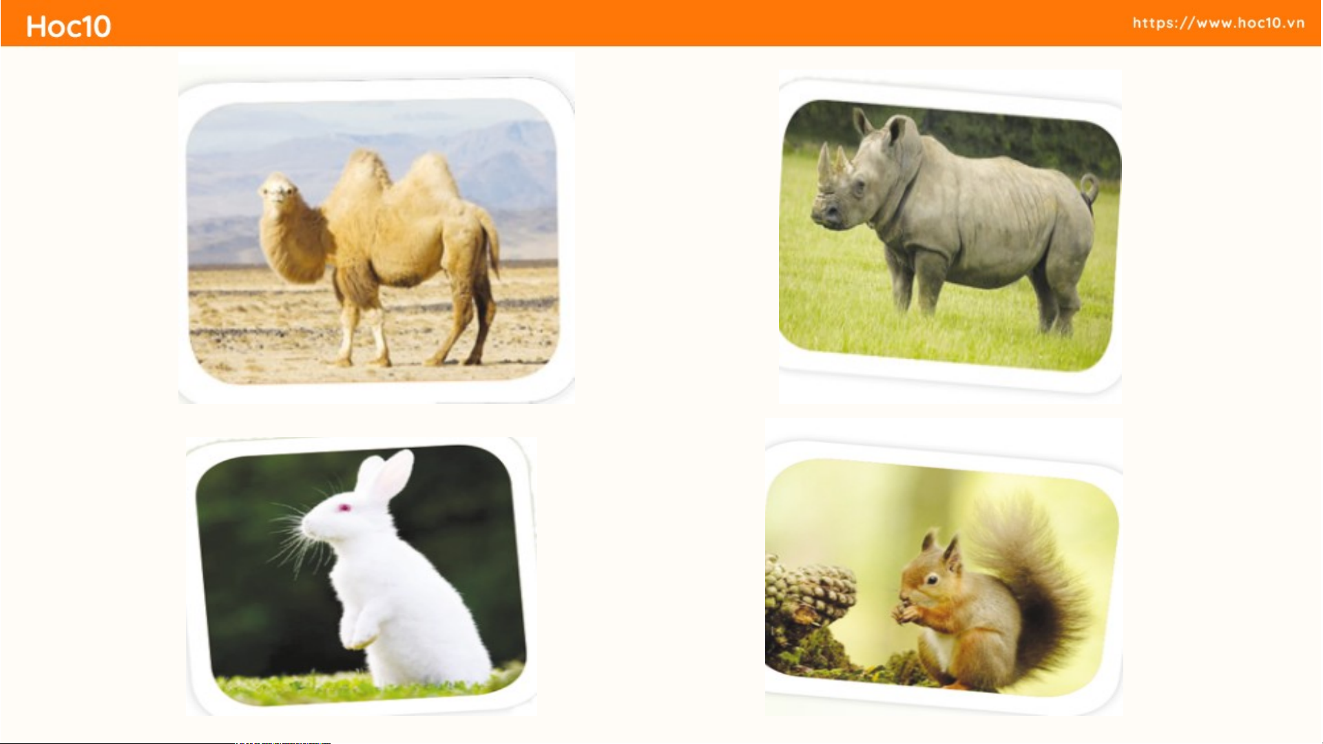 Mắt hồng, lông mượt, có tài chạy nhanh? A. Con gấu túi B. Con thỏ C. Con chuột túi D. Con lạc đà Chuyển cành mau lẹ Có cái đuôi bông Hạt dẻ thích ăn Con gì thế nhỉ? A. Con khỉ B. Con vượn C. Con sóc D. Con chim CẢM ƠN CÁC BẠN