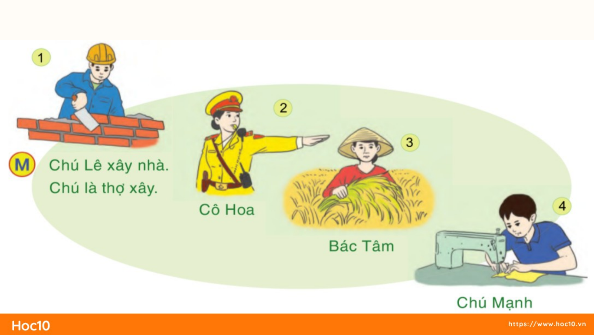 Chú Mạnh đang may quần áo. Bác là nông dân. Chú là thợ may.