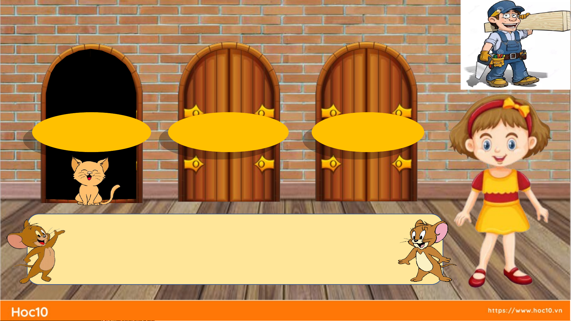 đúng các câu hỏi để tìm chú mèo giúp mình nhé! A B C Cô giáo Bác Bá la c o l a cô o ng công Cô giáo Chú C b hú ảo b vệ ảo vệ Ai là người đến lớp Chăm chỉ sớm chiều Dạy bảo mọi điều Cho con khôn lớn? A B C Giáo viên Thợ T đ hợ i ệ đ n iện Công Cô a ng n an Giáo viên Chú mặc áo vàng Đứng ở ngã ba Trên mọi đường phố Chỉ lối xe đi Nghề gì thế nhỉ? A B C Bác sỹ Nông dân Thợ Th ợ Bác sỹ Nông dân xâ xyây