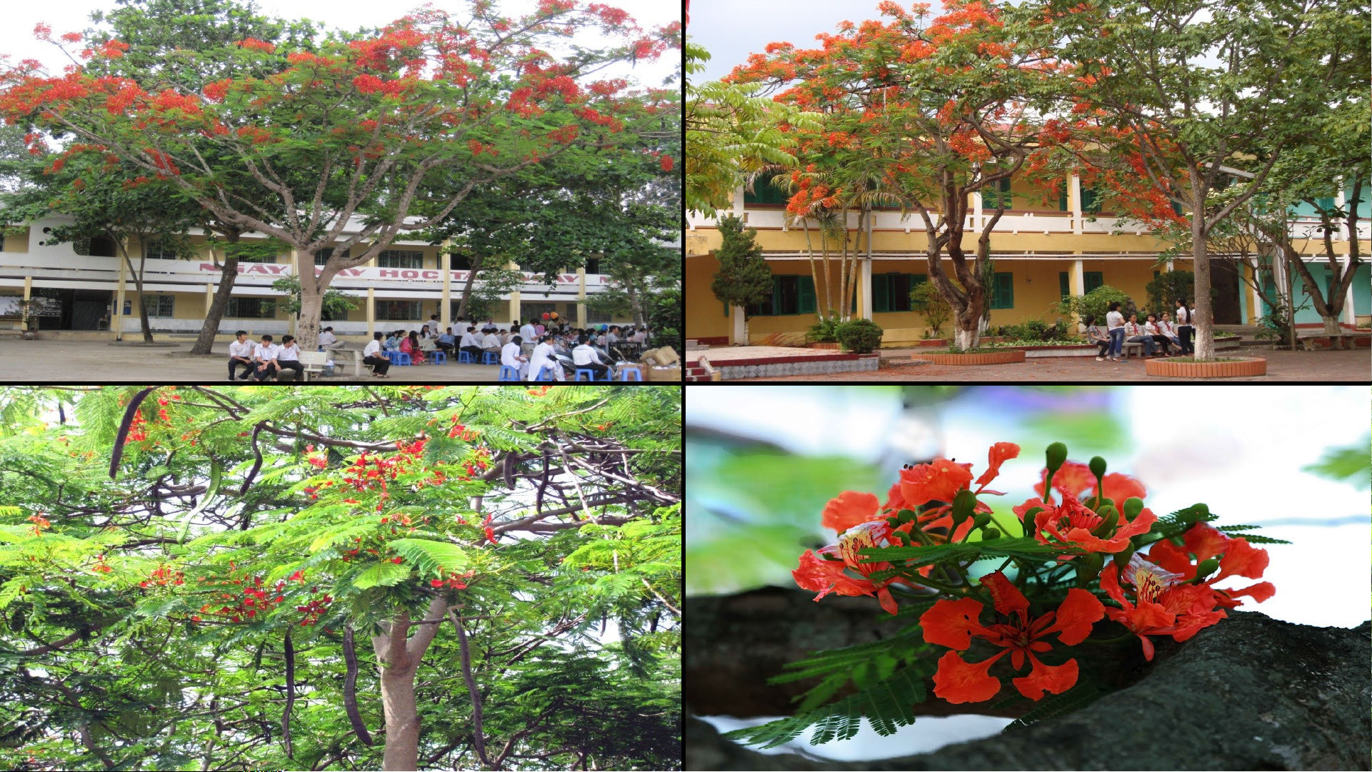Cây bàng cao quá tầng một của trường em. Hoa phượng màu đỏ.