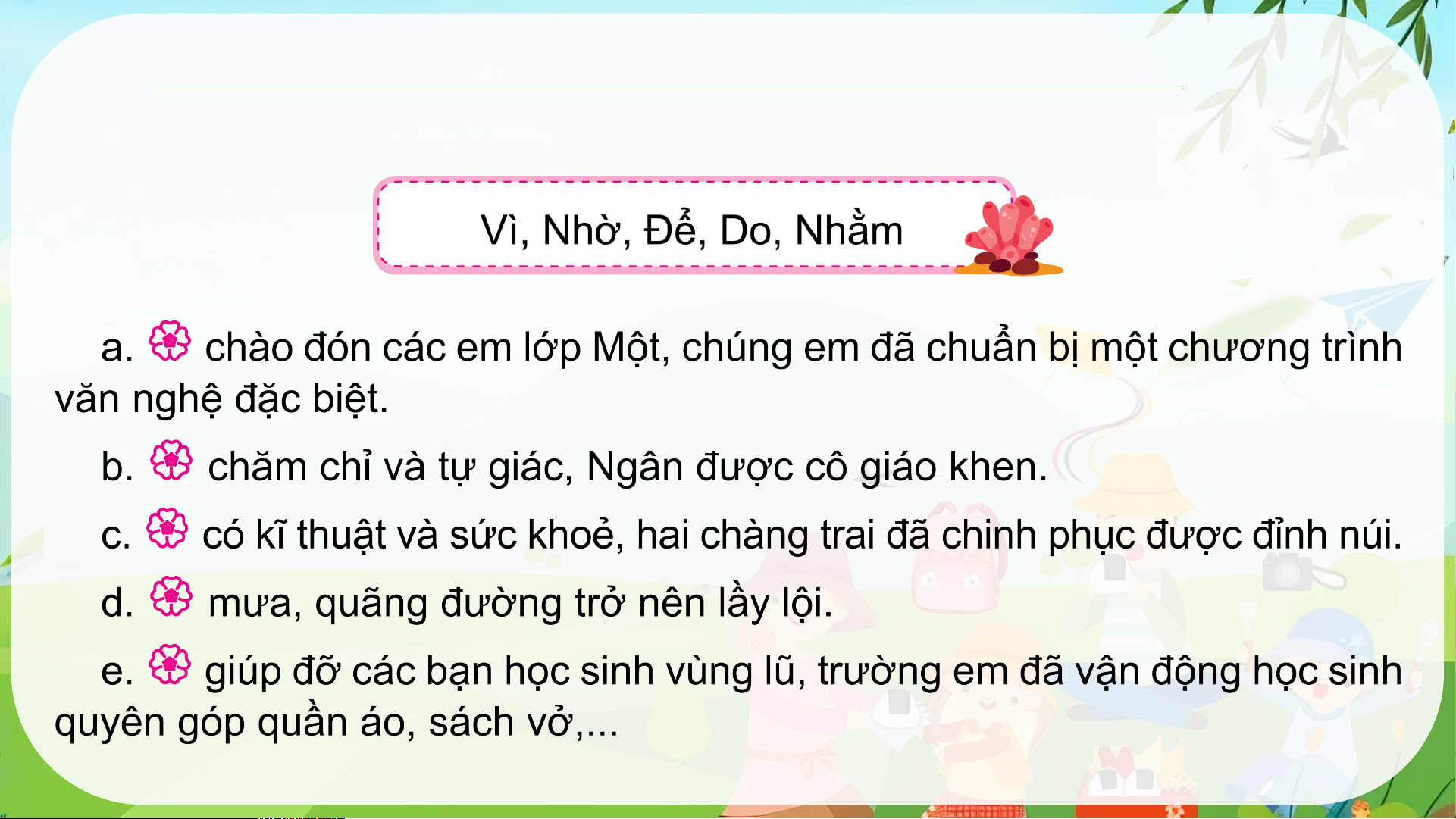 b. Nhờ chăm chỉ và tự giác, Ngân được cô giáo khen.