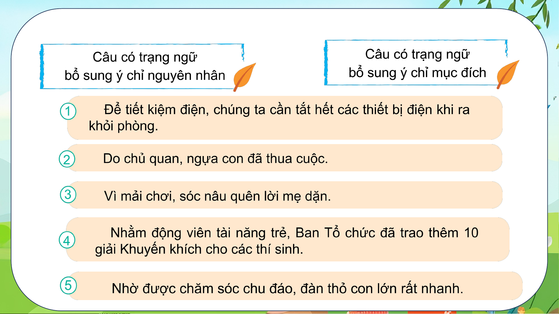 TRẠNG NGỮ CHỈ MỤC ĐÍCH, NGUYÊN NHÂN MỤC - Nhận diện T và IÊ biế U t sử dụng trạng ngữ