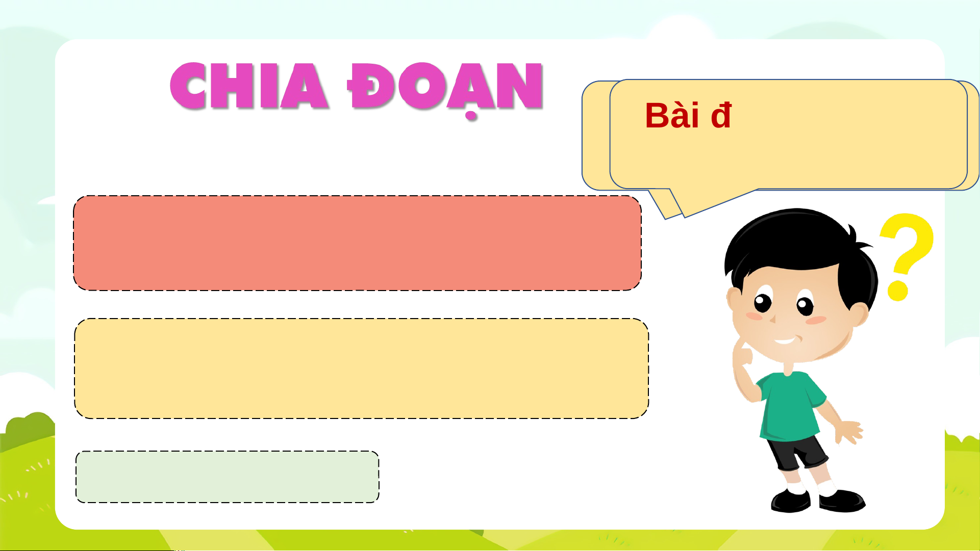 ủ buổi chiều hè vùng ngo i ạ ô th t ậ đáng yêu. Nh n ư g có lẽ thú v ịnh t ấ trong chi u ề hè ngo i ạ ô là đư c ợ th ả di u ề cùng lũ b n ạ . Kho n ả g không gian vắng lặng nơi bãi c ỏ g n ầ nhà t ự nhiên chen chúc nh n ữ g cánh di u ề . Di u ề c c ố , di u ề tu, di u ề sáo đua nhau bay lên cao. Ti n ế g sáo di u ề vi vu tr m ầ b n ổ g. Nh n ữ g cánh di u ề m m ề m i ạ nh ư cánh bư m ớ . Nh n ữ g cánh diều như nh n ữ g m n ả h h n ồ u ấ th ơ bay lên v i ớ bi t ế bao khát v n ọ g. Ng i ồ bên n i ơ c m ắ di u ề , lòng tôi lâng lâng, tôi mu n ố g i ử ư c ớ m ơ c a ủ mình theo nh n ữ g cánh di u ề lên t n ậ mây xanh. (Theo Nguy n ễ Thu ỵ Kha) Bài đọc Bài đ chia làm ọc chia là m mấy 3 đoạ đoạ n? n Đoạn 1: t ừ đ u ầ đ n