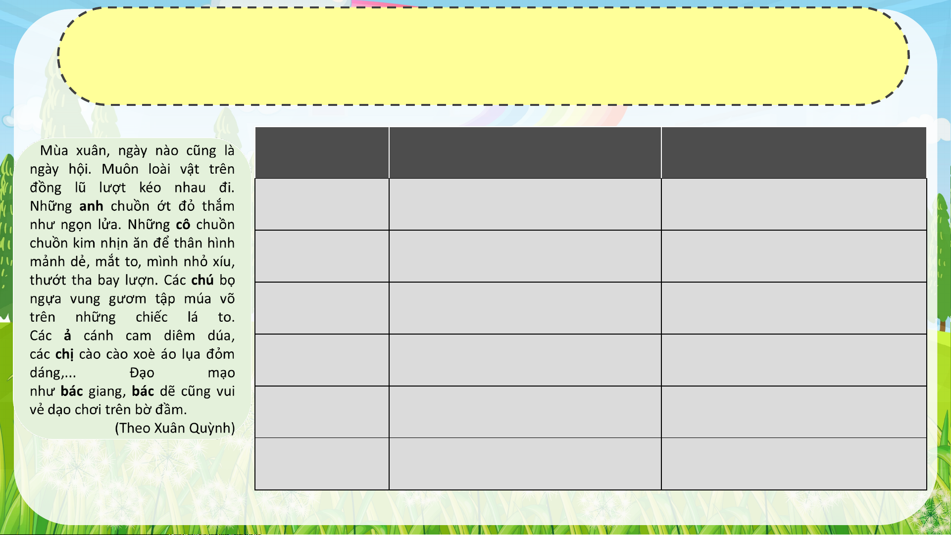 Mùa xuân, ngày nào cũng là ngày hội. Muôn loài vật trên đồng lũ lượt kéo nhau đi.